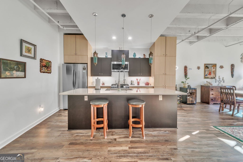 Have we got a view for you! Why settle for a unit with a view of a building that feels like it's within arm's reach, with a view that never changes? Instead, buy a home with a view of lush, green trees that you can almost touch! With new windows and a height on Peachtree Street that keeps noise at bay, you'll enjoy parades and stunning views that are constantly changing and always exciting. This spacious 1-bedroom, 1-bathroom condo on the 5th floor has been thoughtfully renovated with high-end finishes that maximize both style and space, so you can move in with ease. Natural light pours into the unit, greeting you with high ceilings, fresh paint, new window shades, and beautiful Rigid Luxury Vinyl Floors that create a stylish and comfortable living space. The modern kitchen has been updated with sleek quartz countertops, a new tile backsplash, a new Samsung microwave and range, updated hardware, and a ShelfGenieTM pull-out system in the cabinets. The kitchen island doubles as a breakfast bar, perfect for enjoying a cup of coffee or a quick meal. The luxurious bathroom boasts stunning finishes, including a new commode, shower, vanity, cabinetry, and mirrors. The bedroom features a custom walk-in closet, and the separate laundry room includes a new washer and dryer. Newly installed double-paned, insulated glass windows will also help save on your energy bill. This unit comes with 2 private, secure parking spaces (additional fee of $284.12/month), along with a 24/7 concierge, a full-time on-site building manager, assigned storage, a heated saltwater pool, gas grill, and a fire pit. Enjoy additional amenities like a club room with a caterer's kitchen and high-speed Google Internet. Located in the heart of Midtown, you're just steps away from shops, restaurants, the Fox Theatre, MARTA, Piedmont Park, the High Museum, coffee shops, the BeltLine, major universities, and interstate highways. Note: Parking spaces are available for lease to other residents if you don't need both.