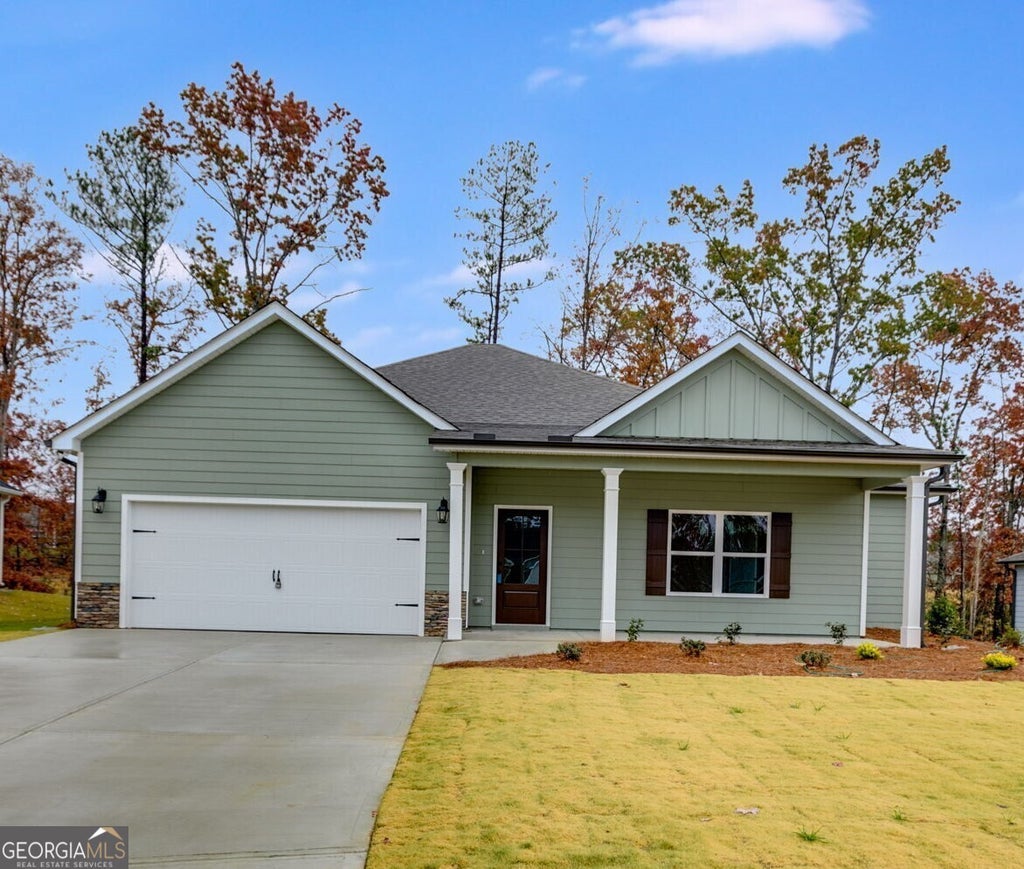 The Diaz is a ranch home with level driveway. This newly constructed home offers a blend of comfort and elegance with thoughtful details throughout. The Diaz Plan home features a spacious granite island and countertops in the kitchen and baths, along with wood cabinets boasting soft-close hinges. All stainless-steel appliances, including a gas stove, make cooking a breeze. Enjoy durable LVP flooring in wet areas and a tiled floor and shower in the master bathroom. Cozy carpeted bedrooms provide relaxation, while a gas fireplace with stone features adds warmth and character. The master suite boasts trey ceilings, a fan, double sink vanity, tiled shower, separate garden tub, and walk-in closets for ample storage. Unwind on the covered front porch or rear patio, plus, enjoy the convenience of included gutters, window blinds, window screens and security lights. This home also comes with a termite system and an 8-year home warranty for peace of mind. Located in the Enclave at St Andrews Community, amenities include sidewalks, streetlights, AT&T high-speed fiber internet, underground utilities, natural gas, county water and sewer, all for a low HOA fee of $250 per year. Excellent schools and a peaceful location in Winston, southwestern Douglas County. Conveniently situated near Douglasville, Newnan, Carrollton, and Villa Rica, with the added perk of being just 35 minutes from Atlanta Airport. ** Builder will change accent wall color to color of your choice**