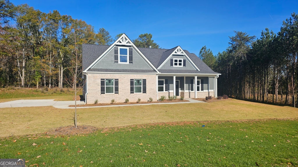 Craftsman style ranch, 4 bedroom, 2 1/2 bath, open great room with wood burning fireplace, kitchen has custom white cabinets, granite countertops, large kitchen island, stainless appliances, breakfast area, large master suite, walk in closet, master bath has large tile shower, soaking tub, double vanity, covered porch, 2 car garage, warranty, Young Plan, home is complete