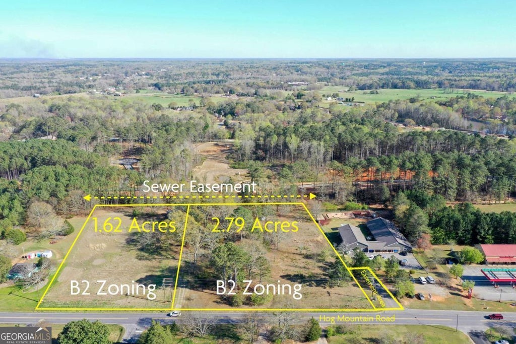 Prime real estate opportunity situated on Hog Mountain Road! This property boasts a highly sought-after zoning classification of B2, offering immense potential for various commercial endeavors. This 1.62 acre parcel of land has a sewer easement is in place, facilitating easy utility connections for any development plans. The great location of this property along Hog Mountain Road presents an excellent opportunity for businesses seeking high visibility and accessibility. Close proximity to surrounding amenities, this parcel (Tract 1 - 1.62 Acres) is primed for success in a bustling commercial environment. Adjoing Tract (Tract 2) also available for purchase separate or together.