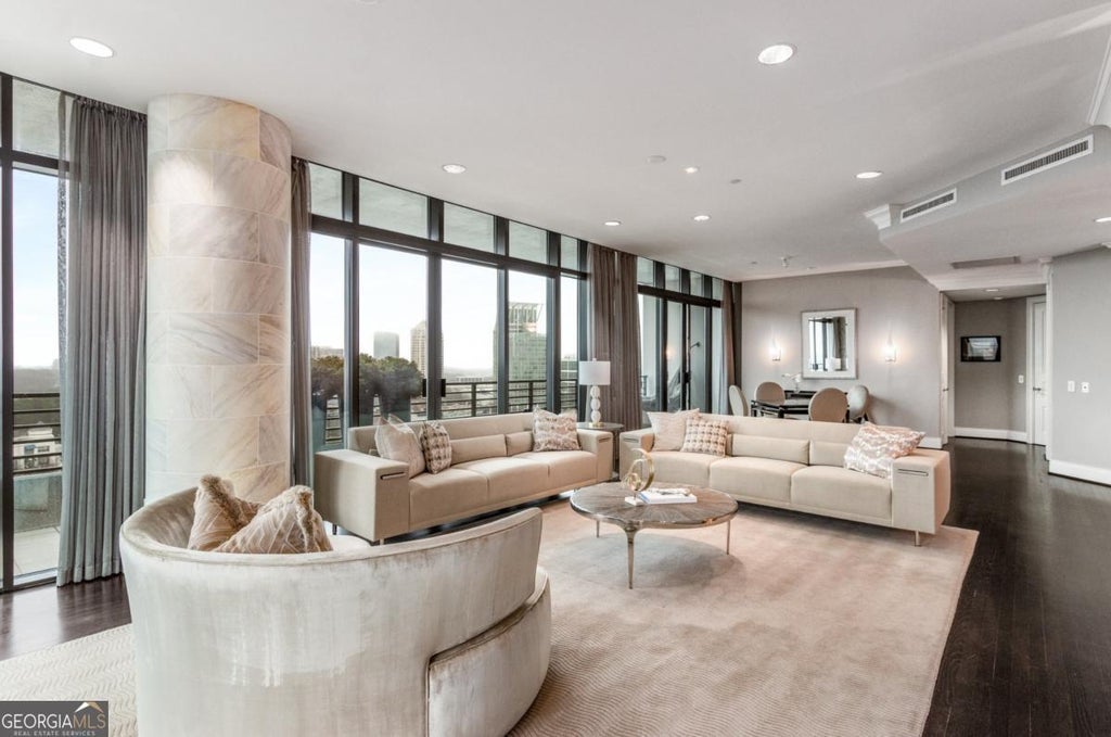 Welcome to 19E. Your new home awaits! Nestled behind Phipps Plaza, 750 Park Avenue is an iconic building in a quiet neighborhood, just steps away from some of the best shopping and dining in the southeast. While the hustle and bustle of Peachtree is just around the corner, entering this exclusive gated community draws you into a world of relaxation, privacy, serenity, and security. As you pass through the gates, you'll be greeted by valets ready to assist with your car and packages. Inside, the beautiful art deco design makes you feel like you've entered another world. The concierge welcomes you home and sends you up the semi-private elevator, which opens into your own private foyer. The dark hardwood floors add a touch of glamour and sophistication, and the Poggenpohl kitchen with an eat-in breakfast area is absolutely stunning. The primary suite is spacious, featuring his and hers walk-in closets and a luxurious bath. On the opposite side of the home, you'll find a fabulous laundry room and a guest suite with its own private bath. The 19th-floor views are breathtaking, with several walk-out balconies to enjoy them from. This home also includes a 2.5 car private deeded garage, a rare feature in the building. Park Avenue offers the vibrancy and energy of in-town living while balancing the luxuries and conveniences of unparalleled features, amenities, and services. Enjoy a grand lobby with welcoming Lobby Ambassadors, valet parking, attentive staff, 24/7/365 electronically monitored access controls, gated entrance and grounds, a gated secure parking garage, an event room with a full catering kitchen, a heated saltwater pool, a fitness center with steam and sauna, a second social room with a coffee bar, a climate-controlled wine cellar with assigned bins for each homeowner, two guest suites available for owners to rent for their guests, a convenient pet walk, community EV charging stations, an emergency call system and water leak detection system in every home, and assigned storage with every home. Experience the ultimate in Lock and Leave living!