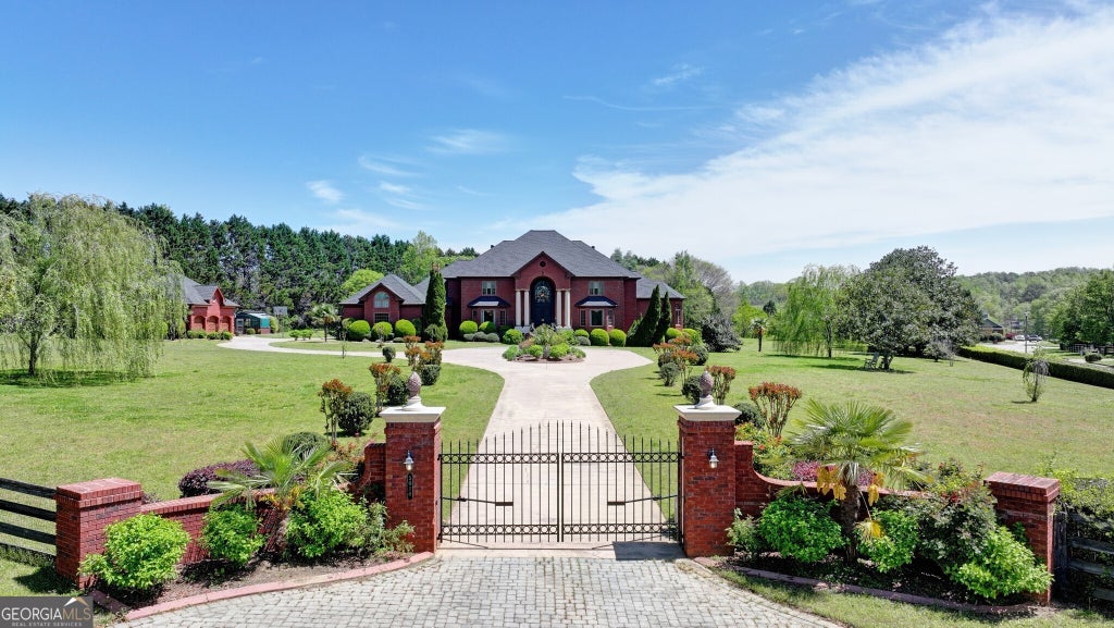 Stunning Gated Estate on 5+ Acres of Beautifully Landscaped Grounds! Welcome to a world of refined luxury and timeless elegance. This Grand Brick Estate is perfectly situated on over 5 Breathtaking Acres, surrounded by Gated Privacy, Mature Landscaping, and a commanding Architectural Presence. As you arrive through the Iron Gates and glide along the Circular Driveway, you're greeted by Lush Gardens and an unforgettable first impression. Designed for elegant living and gracious entertaining, this 6-Bedroom Masterpiece with one of the Bedrooms located in the Detached Carriage House effortlessly accommodates Multigenerational Living, long-term guests, or an expansive Work-From-Home Lifestyle. Inside, every detail radiates sophistication: Soaring 10'+ Ceilings, a Grand Two-Story Foyer, gleaming Hardwood Floors, Herringbone Patterned Flooring in the Dining and Living Rooms, Coffered Ceilings, Designer Fixtures, and seamless flow between Light-Filled Living Spaces. The Gourmet Kitchen is truly a Chef's Dream outfitted with premium Wolf and Bosch Appliances, rich Wooden Cabinetry, Granite Countertops, Gas Range, Walk-In Pantry, Hidden Butler's Pantry, Wine Rack, Breakfast Bar, and a sun-kissed Breakfast Room overlooking the Grounds. Multiple Living Spaces offer comfort and flexibility, while the elegant Dining Room with Wainscoting Detail sets the stage for memorable gatherings. The home offers an Extraordinary Main-Level Owner's Suite truly a private retreat. This Grand Bedroom features a spacious Seating Area perfect for morning coffee or evening relaxation, along with serene views of the Pool and Garden Oasis. The Spa-Inspired Bathroom is nothing short of breathtaking, adorned in Gorgeous Tile from floor to ceiling, and featuring Dual Vanities, a Soaking Tub, Oversized Walk-In Shower, and Two Separate Walk-In Closets. Every inch of this suite is designed for comfort, elegance, and everyday indulgence. Upstairs, Four generously sized Secondary Bedrooms feature Tray Ceilings, Walk-In Closets, and Private Full Baths ensuring privacy and luxury for all. All Bathrooms are finished with White Tile that Extends to the Ceiling, adding a crisp, high-end feel throughout. The finished Terrace Level opens up a world of possibilities with a large Living Area, Office Space, Formal Dining, Home Gym, Two Potential Bedrooms ideal for a Day Sleeper or flexible Guest Space, massive Wine Cellar, and room for a Media Room or Playroom the ultimate Flex Space. Step outdoors into a Resort-Style Paradise. The heated Saltwater Pool sits just steps from a Covered Lounge and Dining Patio, a Screened Pool House with a Wet Bar, a charming Greenhouse, and acres of Open Lawn with Room for Customization and Enhancement. This Property truly shines with its expansive Outdoor Living Spaces perfect for unwinding, entertaining, or simply enjoying the beauty of Nature in complete privacy. The Three Attached Garages and Three Detached Garages provide extensive parking and storage options, with the Detached Carriage House above featuring a Full Kitchen, Bedroom, and Bathroom ideal for Guests, Extended Family, or Independent Living. Additional features include a brand new Architectural Roof, private Well with elite Soft Water Filtration System, 5-Zone Irrigation, and a commercial-grade 40KW Whole-Home Generator for peace of mind. Perfectly positioned about an hour from Atlanta's Hartsfield-Jackson Airport and within easy reach of Lake Lanier, local wineries and exceptional Dining and Shopping options, this one-of-a-kind Estate combines grand-scale living with everyday comfort in an unmatched setting. Come experience the Space, Beauty, and Serenity this exceptional Property has to offer you won't want to leave.