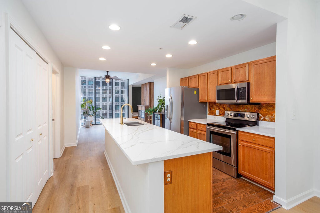 Luxurious One-Bedroom at Ovation in the Heart of Buckhead. LARGEST ONE BEDROOM FLOORPLAN. Welcome to the desirable and upscale Ovation condominium, ideally situated in the vibrant heart of Buckhead. A beautifully appointed lobby with full-service concierge sets the tone for luxury living from the moment you arrive. This rare, extended one-bedroom floor plan offers a perfect blend of functionality and elegance. The open-concept kitchen with newly designed island and gorgeous quartz countertops, stained cabinets, and a dedicated eat-in dining area-ideal for entertaining or casual meals. Expansive floor-to-ceiling windows bathe the space in natural light while framing spectacular views of the St. Regis and glittering city lights. The extended living area offers incredible versatility-perfect for a cozy den, stylish home office, or even a guest space with a built-in futon--CAN EASILY BE CONVERTED TO A SECOND BEDROOM. Retreat to a generously sized primary suite with two closets for ample storage. The bathroom is equally impressive with a deep soaking tub and a shower combination designed for relaxation. Ovation residents enjoy premium amenities including a newly renovated fitness center, refreshed pool, Club Room, sauna, grilling areas, and even a guest suite for visitors. Step outside and find yourself just moments from Buckhead's finest dining, world-class shopping, and premier entertainment