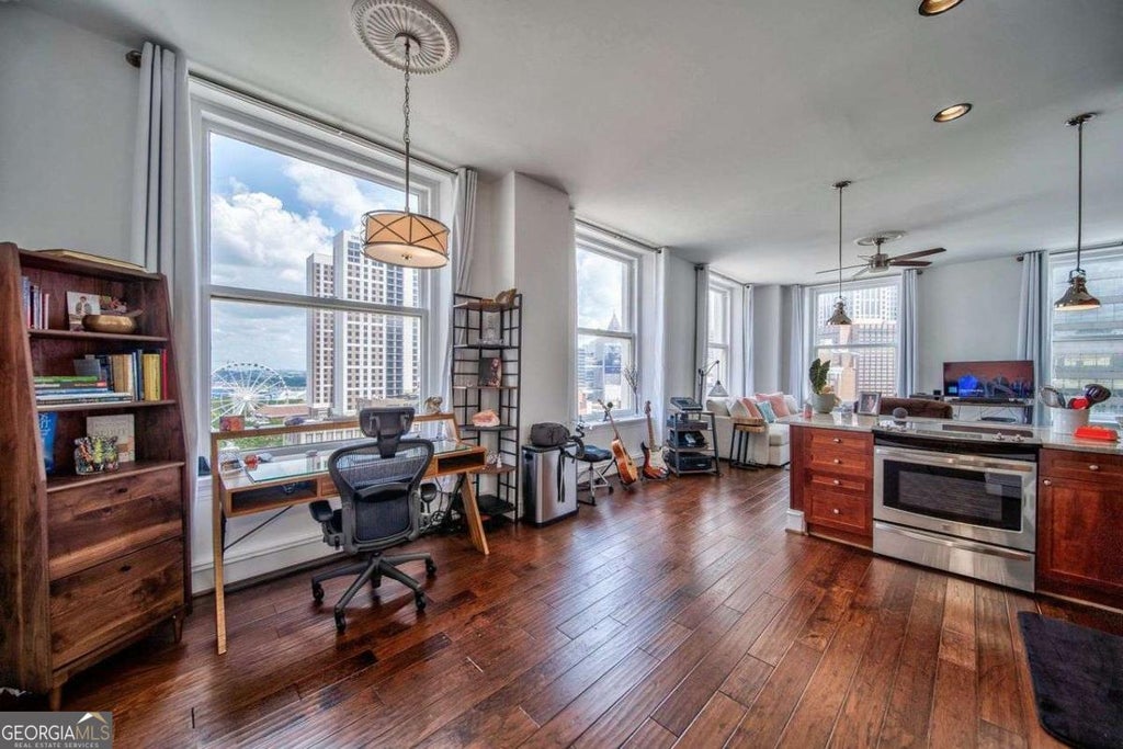 Welcome to a stunning 12th-floor condo in the historic Healey Building, a crown jewel of Atlanta. The neighborhood is a hot-spot for the film and entertainment industry. From the moment you step into this corner unit, you'll be captivated by the breathtaking city scape views framed by vintage 9' windows that flood the space with natural light. Imagine overlooking iconic Atlanta landmarks like the Mercedes Benz Stadium, Skyview Ferris Wheel, Georgia Aquarium, and Centennial Olympic Park, all from the comfort of your living room. This condo is a front-row seat to Atlanta's vibrant Arts & Entertainment District, with direct access to the lively Broad Street Boardwalk, bustling with cafes and eateries. You'll also find unmatched convenience with nearby transit options, including the Atlanta Streetcar, Five Points and Peachtree Center MARTA stations, putting Midtown, Buckhead, and even the airport within easy reach. Living in the Healey Building comes with an impressive array of amenities designed to elevate your lifestyle. Residents enjoy high-speed fiber internet, 24-hour concierge and security services, a guest suite for visitors, a conference room, and even a vintage mail chute. The building's modernized features include remote keyless entry to secure access points, fitness and cardio facilities, updated elevators, and an electronic locker/package system. This condo offers the perfect blend of historic charm and modern convenience.