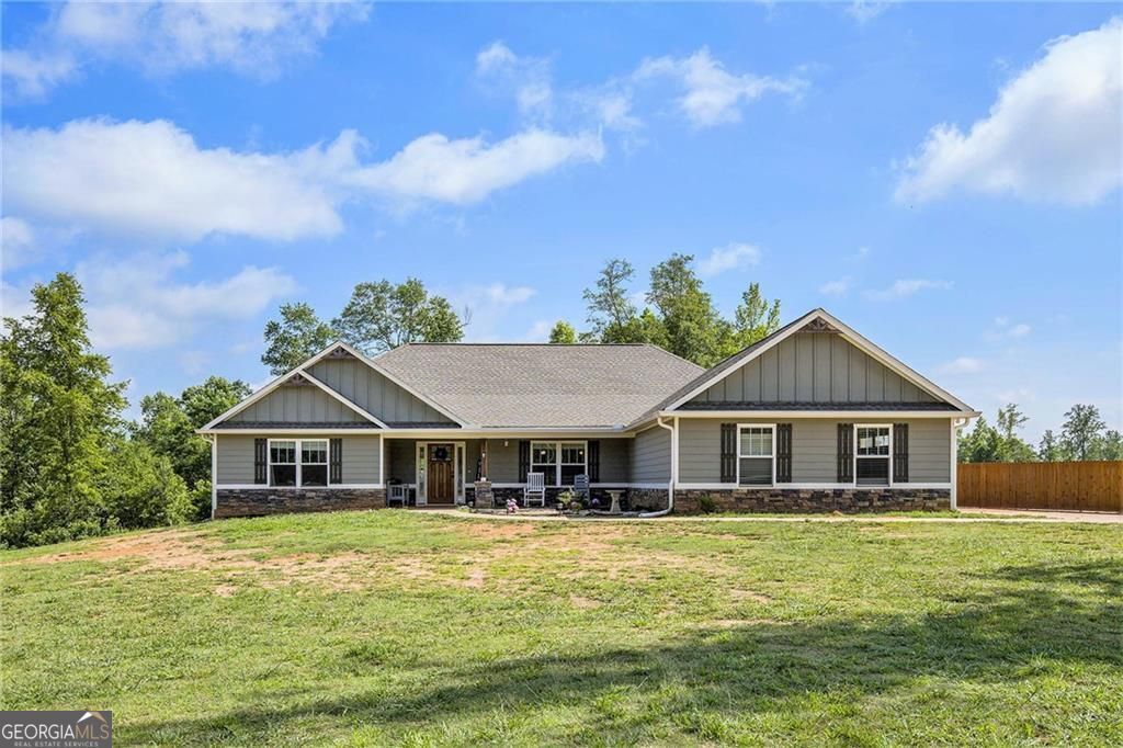 Welcome to 569 Lovell Road, a beautifully crafted custom ranch home nestled on a tranquil 4-acre lot in Temple, GA. Built in 2021 by Southern Ridge Homes & Development, this 3-bedroom, 3-bathroom residence offers a perfect blend of elegance and functionality. Home Features * Open Concept Living: The spacious family room features a custom stone fireplace, creating a cozy atmosphere. The gourmet kitchen boasts custom cabinets, a large island, granite countertops, and stainless steel appliances, making it ideal for both cooking and entertaining. * Master Suite Retreat: The main-level master suite offers a serene escape with a luxurious bath featuring a tiled shower and bench, double vanity, and walk-in closet. * Versatile Floor Plan: The split-bedroom layout includes a secondary master suite with an ensuite bath, perfect for guests or as a private office. * Outdoor Living: Enjoy the outdoors on the large rear porch, ideal for relaxing or hosting gatherings. Property Highlights * Private Acreage: Set on a peaceful 4-acre lot, this home offers privacy and space for various outdoor activities. * Quality Construction: Built with attention to detail, featuring concrete and stone exterior materials and a composition roof. * Energy-Efficient Features: Equipped with modern heating and cooling systems, including ceiling fans and electric air filters. Location & Community Located in Carroll County, this home is part of the Sharp Creek Elementary, Temple Middle, and Temple High School districts. The property offers a peaceful rural setting while remaining conveniently accessible to local amenities and major roadways. Don't miss the opportunity to own this exceptional home that combines modern amenities with a serene country setting. Contact us today to schedule a private showing!