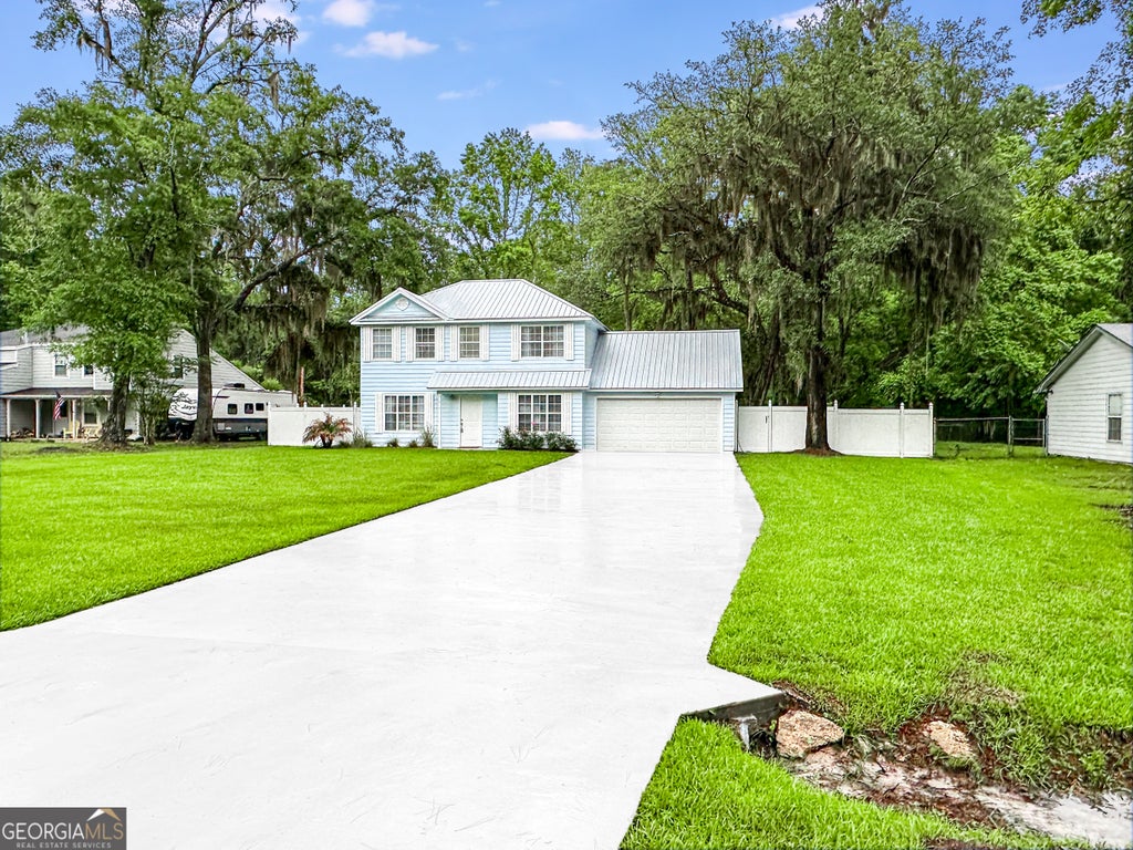 1-Year AHS Home Warranty Included! This beautifully updated 3-bedroom, 2.5-bath home sits on approximately half an acre surrounded by moss-draped oaks in the peaceful Harriett's Bluff community-just 15 minutes from NSB Kings Bay. Step inside to find new LVP flooring throughout the main level and owner's suite, plus new carpet in the two upstairs bedrooms. The kitchen features chevron-patterned butcher block countertops, a movable island, stainless steel appliances, and cabinetry painted in a warm, woodsy green. A custom walk-in pantry with open stained shelving is both functional and stylish-pretty enough to leave the doors open. Enjoy both a formal dining room and a breakfast nook with a bay window overlooking the backyard. A renovated half bath on the main floor adds guest convenience, while the living room opens through new sliding glass doors to a spacious back deck and fenced yard, perfect for outdoor entertaining. Upstairs, the owner's suite showcases a tray ceiling, walk-in closet, and a renovated bath with double vanity, tiled shower, slipper tub, and wood-look tile flooring. The guest bath also features a unique tiled shower and matching wood-look tile. Additional highlights include crown molding throughout, a two-car garage with cabinets and laundry hookups, washer and dryer conveying with the property, a tankless water heater, new HVAC, and a metal roof. The freshly sealed garage floors add a clean, finished look. Located in Flood Zone X (no flood insurance required) and outside city limits (no city taxes), this property offers practical value with a serene setting. You're just minutes from the Harrietts Bluff deep-water boat ramp and less than 10 minutes to Kingsland amenities-including Chick-fil-A! This home blends comfort, convenience, and style-with all the major upgrades compete!