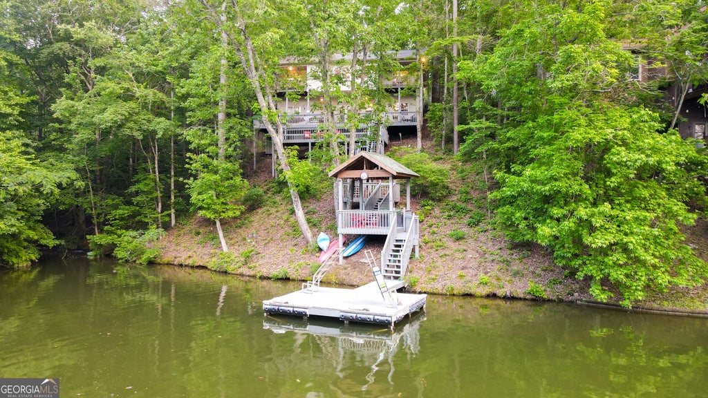 Charming lakefront home ready for lake living! Enjoy the lake life in this beautifully maintained home, in a great location with 173 feet of shoreline. Nestled in a peaceful cove with scenic views of the open water. Two spacious decks provide ample outdoor living space and lead to a covered pavilion at the water's edge, complete with a stationary dock. The home features an open kitchen and living area great for gathering. The main level includes the master bedroom, a second bedroom, a full bath and a spacious laundry room. On the terrace level, you'll find a large rec room, living space, an additional bedroom, a full bath, and a convenient half bath. Recent updates include freshly stained back decks and steps, as well as a brand-new roof installed in Fall 2024. Come see for yourself the privacy & charm this home has to offer!