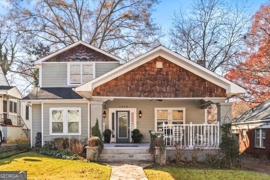 Welcome home to this beautifully preserved 1930s gem, where historic character meets modern updates. Featuring hardwood floors throughout, the open-concept layout includes a cozy fireplace in both the living and dining areas. The updated kitchen is a chef's dream, showcasing granite countertops, a spacious island, Samsung stainless steel appliances, a wine cooler, a pantry, and plenty of cabinetry. This single-level home offers three bedrooms and two and a half bathrooms, including a Jack-and-Jill bath with a double vanity connecting the secondary bedrooms. The owner's suite boasts a luxurious en-suite bath complete with a double vanity and a relaxing soaking tub. A spacious attic offers expansion potential, while outdoor living is made easy with a large rear deck, a generous front porch, and a fenced, private backyard. Additional highlights include a detached two-car garage with abundant off-street parking. Above the garage, an unfinished carriage house with one bedroom and one bathroom provides excellent rental income opportunity once completed. Ideally located just 15 minutes from downtown and steps from a MARTA stop, this home perfectly blends timeless style with everyday convenience!