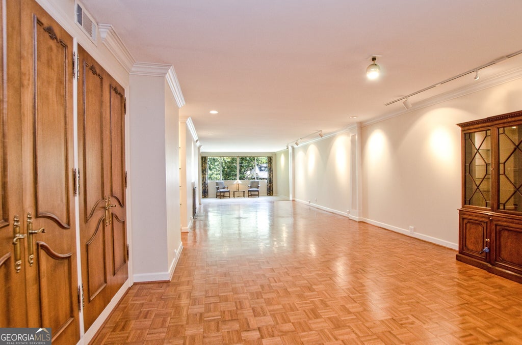 The largest condominium in the Peachtree Andrews complex, this unit is vacant and ready for your updates. 9' ceilings, hardwood floors and gas fireplace, this large open floor plan runs from the open kitchen, dining area and fireside living room all the way to the large picture window overlooking neighboring Tarrymore. So many ways to use this space. Enter in to a long gallery style hallway with two walk in closets and shelving perfect for hanging art or showing off collectibles. Tremendous primary suite with his/her closets/ bath/ sitting room and glassed in small porch with windows to the exterior. Guest bedroom/walk in closets with hall bath. Large separate den with wall of built in bookshelves and closet could serve as a third bedroom if desired. Unlike other units, this unit is complete with a powder room, laundry room and four walk in closets in the public areas great for storage. The dining area also has 3 built in china closets for additional storage. If you are looking for a large open plan condo on Buckhead's golden mile, look no further. This is the best value in town. 2 gated assigned parking spaces and one storage unit. One pet not to exceed 25 lbs.