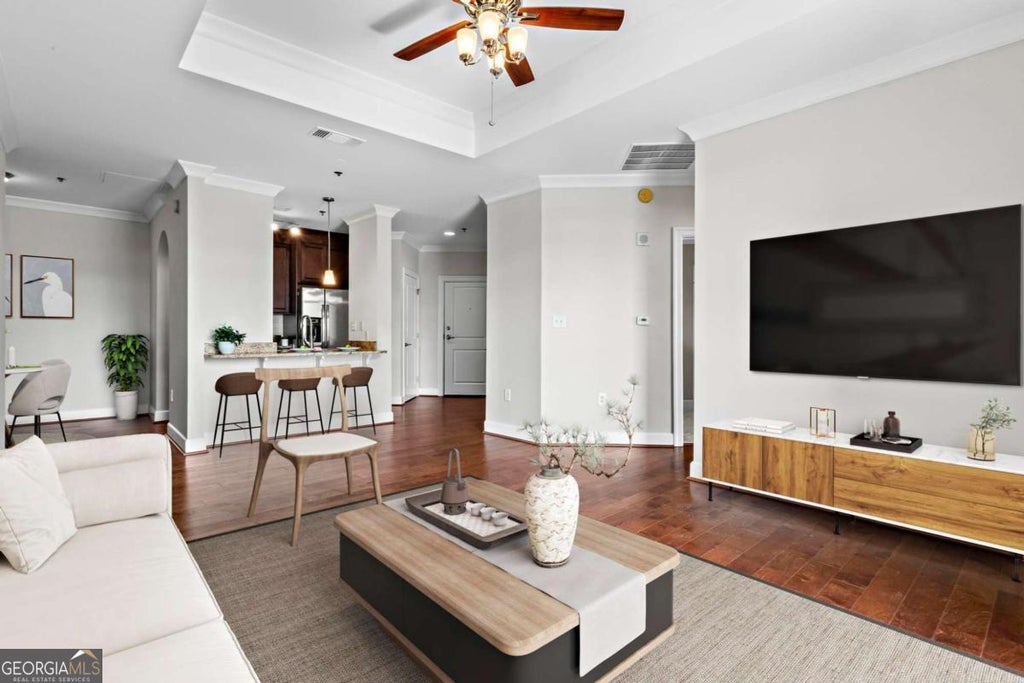 Discover the perfect blend of city energy and everyday comfort at the desirable Paces 325 condominium complex! This complex offers a secure, safe environment with numerous luxurious amenities include a 24-hour concierge, private parking, storage units, in ground pool & entertaining grill area, a fitness center, and modern clubhouse with plenty to enjoy! Step into your new home with one of the largest 1-bedroom, 1-bathroom floor plans in the building that is move-in ready featuring fresh paint, rich hardwood floors, and thoughtful upgrades throughout! The open-concept floor plan with trayed ceilings, crown moulding, and natural light beaming in from the floor to ceiling sliding doors to the private patio makes for a cozy and spacious environment to retreat to from the active lifestyle in the city! This dream kitchen features stained modern cabinets, a custom extended breakfast bar with upgraded granite, and stainless steel appliances with a direct view to the living room & patio. You'll love the flex space unique to this floor plan that could serve as a dining room, office, etc. offering that extra needed space that really opens up the home! The oversized primary bedroom with a trayed ceiling is filled with natural light and equipped with a walk-in closet! Step into the luxurious full bathroom updated with a large vanity, granite countertops, HEATED ceramic tile flooring, and a modern walk-in shower. The home also features a private rear patio with views to the city for the perfect place to unwind with some fresh air. This unit also comes with a private parking permit and climate-controlled storage unit! Outside of the condo, the real bonus is being steps away from everything that Buckhead has to offer including top-rated restaurants, shopping, coffee shops, nightlife - you name it!. The perfect lifestyle in the city with the convenient retreat to your home is unmatched and ready for you to call home!