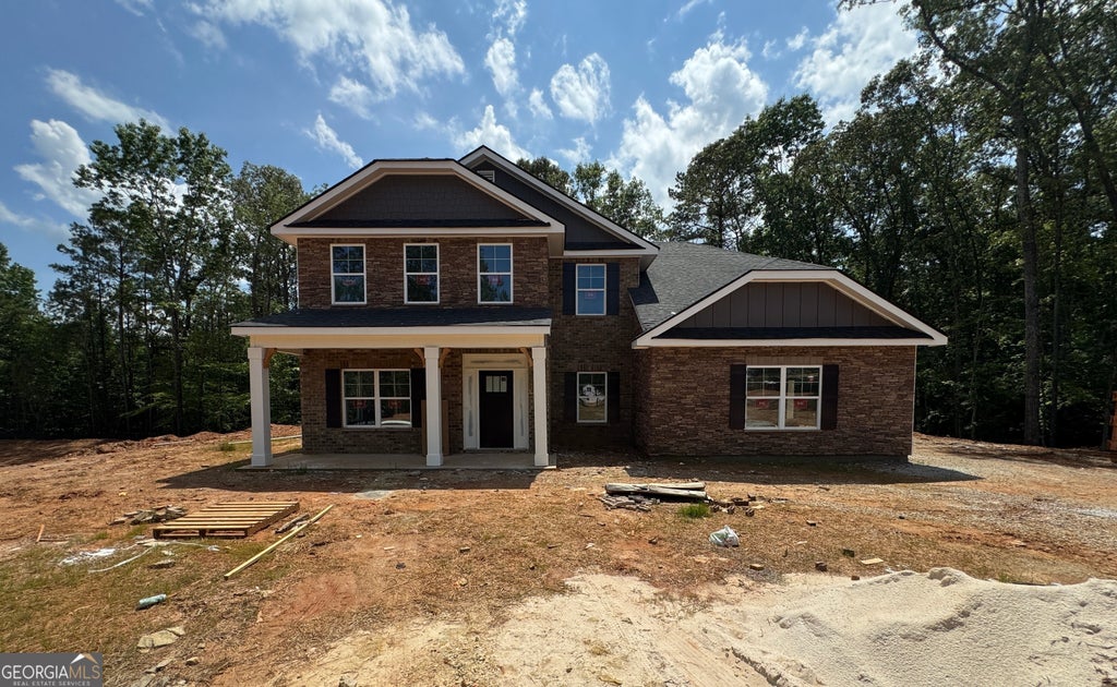 Under Construction - Homesite #93: This stunning 4-bedroom + loft, 3.5-bathroom brick and stone front two-story home offers 3,320 square feet of thoughtfully designed living space on nearly an acre of land. The spacious floor plan features a primary bedroom on the main floor, perfect for convenience and privacy, along with a separate formal dining room ideal for entertaining. Enjoy soaring ceilings that create an open and airy atmosphere, with views from the second floor overlooking the main living area. The LVP flooring flows throughout the home, with plush carpet in the bedrooms for added comfort. The chef-inspired kitchen includes stainless steel appliances-microwave, dishwasher, and a gas combo cooktop with oven-plus a cozy breakfast area with a view of the beautiful backyard. Unwind in the inviting family room, complete with a woodburning fireplace and elegant open metal handrails that accent the staircase. Upstairs, a spacious loft offers flexibility for a home office, media room, or play area. Step outside to enjoy a covered patio with wooded views, perfect for outdoor living on your private 0.92-acre homesite. Don't miss the chance to make this exceptional new construction home yours!