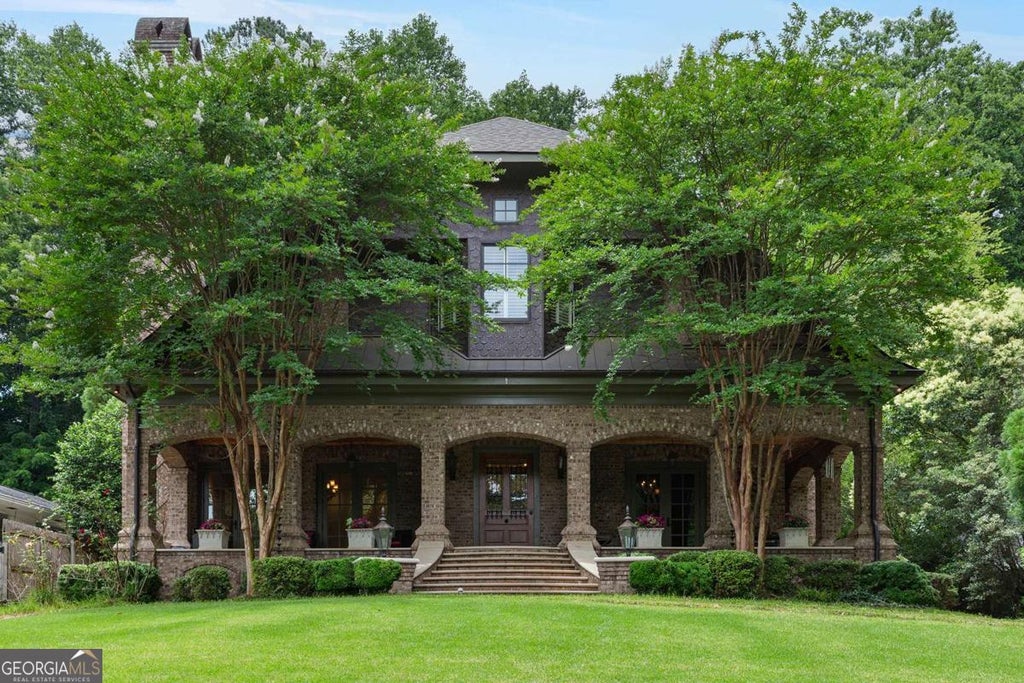 Tucked away in the heart of Atlanta's Sherwood Forest neighborhood, this custom-built estate is a masterclass in architectural detail and refined living. Thoughtfully designed with layered materials and timeless finishes, the home blends old-world craftsmanship with modern innovation. A wide, deep covered front porch with tongue and groove ceiling, gas lights, and ceiling fans spans the front of the home-creating a gracious welcome and an ideal space for year-round enjoyment. Inside, generous open rooms flow seamlessly, designed for both relaxed living and entertaining. Both the formal dining room and the fireside office/library open directly onto the covered front porch through sets of French doors, enhancing the home's indoor-outdoor connection and providing an exceptional entertaining flow. Custom leaded-glass doors close off the library for quieter moments by the cozy fireplace. A dramatic two-story foyer with an imported Italian tiled ceiling and Turkish terracotta flooring sets the tone for the home's timeless details. Seven fireplaces-each capped with custom stone and brickwork that mirrors the banister finials-anchor the home with warmth and artistry. Beamed ceilings, hardwood floors, and finely crafted millwork add depth throughout. The main kitchen is outfitted for serious culinary work, featuring dual refrigerators, dual dishwashers, a butler's pantry, three sinks, and bespoke cabinetry. A second full kitchen on the terrace level adds versatility for hosting or multi-generational living. The main level also features a secondary primary bedroom suite-ideal for guests or those seeking one-level living. Upstairs, the primary suite is a true retreat, with vaulted ceilings, an oversized walk-in closet with space for a private office or dressing lounge, and a beautifully tiled bath with fireplace-creating a serene and luxurious atmosphere. Also on the lower level: a 1,000+ bottle wine cellar with tasting room, a fireside entertaining lounge featuring a generous fireplace and a stunning original bar-meticulously reassembled on-site after being imported from Europe-a fitness suite with separate laundry and a river stone steam room that fits eight, an office, and flexible space for media or games. The fully updated Control4 system provides intercom, security, and whole-home sound through an integrated speaker system. An elevator serves all levels. Outdoors, a brick loggia with a built-in pizza oven and gas grill overlooks the private, gated backyard and pool-perfect for entertaining or unwinding in total privacy. A whole-house generator provides comfort and peace of mind throughout the seasons.