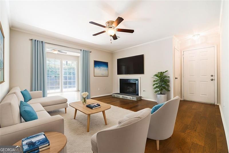 Convenient to I-75/I-285, this updated condo with a spacious two-bedroom floorplan is top notch. Be greeted by a foyer into a large, light-filled living space with fireplace and a sunroom with three walls of windows and patio access. Separate dining area views into the renovated kitchen. The primary bedroom is large with a walk-in closet and the additional bedroom is also spacious and has direct access to the rear patio (also accessible from the sun room). The renovated bathroom features an oversized vanity and separate water closet with renovated shower. Laundry room + utility closet is well-sized.Plenty of storage + great flow minutes from Atlanta proper. Community swim, tennis + more. Minutes from Truist Park!