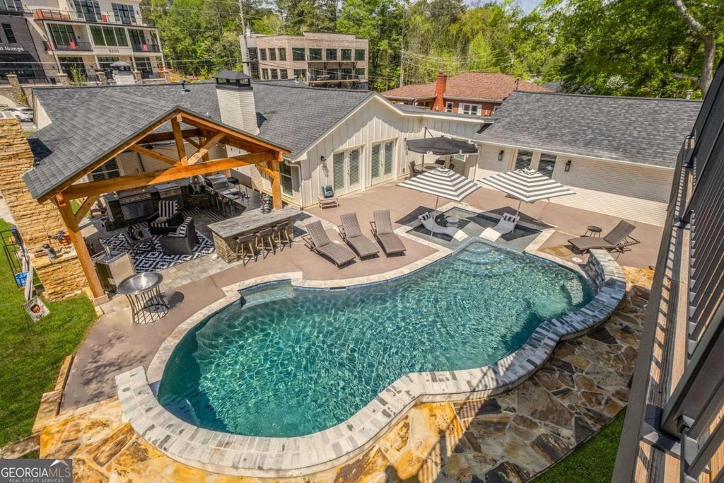 Seize a rare opportunity to own TWO distinct homes on a single lot, ideally situated in the heart of vibrant Downtown Woodstock! 8175 Main Street is a premier location, directly across from prestigious Adair Park, with its restaurants, shops and luxury flats. This dual-living property, perfect for multi-generational living, business, entertaining, or extended stay guests offers exceptional flexibility as well as investment opportunity. The primary residence, originally an historic home constructed in 1948, was masterfully reimagined by owner/designer and her team of architects in 2022 into a stunning residence which retains some of the original timeless charm and character, blended with modern luxury and cutting-edge upgrades. This property was uniquely curated to combine CHARM, LUXURY, CONVENIENCE, OUTDOOR LIVING and ENTERTAINING as its key components. The home boasts a chef's dream kitchen anchored by a breathtaking 12 foot island adorned with a gorgeous Brazilian Quartz, also featured in the backsplash and wet bar in the living area. Entertain effortlessly with a spacious oversized butler pantry, indoor wet bar, and flowing open floor plan. The living area off kitchen is centered around a cozy fire place and has three sets of french doors leading to the show-stopping outdoor oasis poolside. The custom designed pool features a tanning ledge and a unique swim ledge that curves along the water's edge. Outdoor living takes center stage with an outdoor covered kitchen featuring a smoker, oversized gas grill, Blackstone griddle, gourmet pizza oven , dishwasher, two beverage refrigerators and an ice machine, all surrounding a large entertainment area with a cozy outdoor fireplace. There is also a "DJ Balcony" perched above the entertaining space, ready for the party! The main home has wide corridors leading to each of the three bedrooms, perfectly positioned each with its own 'wing" for peace and privacy. A beautifully appointed second residence is located directly behind the poolside oasis, featuring three private bedrooms, one on the main level and two on the secondary level, a split bedroom plan for privacy. The main level features an expansive 6-car garage, which can also be used as indoor event space, an EV charging station, a set up for a second laundry, a dog shower, a private sitting porch ,a custom putting green, and a large detached tool/equipment shed. The second story comprises an open floorplan, kitchenette, dining area, living room, two bedrooms ( one with a balcony overlooking pool with views of downtown, currently used as office space), a full bath and generous closet space throughout. Lovely landscaping, outdoor lighting, a large yard for PETS, a commercial grade security system with AV closet, and a charming front sitting porch overlooking downtown add to the charm and appeal of this special downtown property. Experience all the perks of downtown Woodstock living as you walk to restaurants, spas, shopping, the summer concerts in the park, and outdoor events. Experience life without the hassles and restrictions of HOAs and management fees! This extraordinary property is a rare find--two residences, thoughtfully designed for comfort, entertaining and luxurious everyday living in one of Woodstock's most desirable locations. Zoned DTRO Woodstock