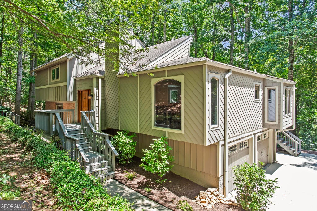 Nature lover's paradise! You will delight in frequent visits from deer, foxes, owls, and an occasional hawk. Tucked away on private, wooded acreage, this beautifully updated home offers peaceful outdoor living with year-round tree views. Large windows fill the space with natural light and connect every room to the surrounding forest. Enjoy a 2-story living room with fireplace, renovated eat-in kitchen with quartz countertops, and a separate dining room with built-ins. The owner's suite features a private balcony that joins the main deck-perfect for relaxing outdoors. A lower-level bonus room, additional bedroom and bath, and 2-car garage offer flexibility. All baths are stylishly updated. Quiet, private, and just minutes from historic downtown Roswell