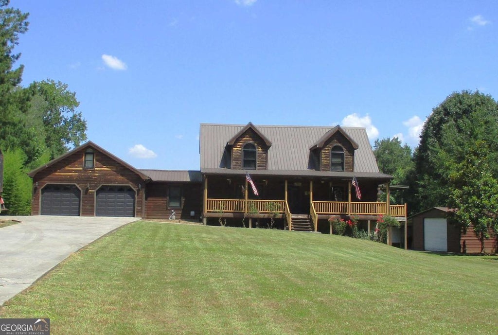 Welcome to your own private getaway-this 3 bedroom, 2.5 bath log home sits on 5 mostly wooded acres with beautiful mountain views and plenty of space to spread out. A big front porch sets the tone for peaceful mornings and quiet evenings, while inside, the home offers a warm and rustic feel with beamed ceilings and a cozy fireplace in the great room. The master bedroom is on the main floor and features a large bathroom with the washer and dryer close by for everyday convenience. You'll love the private covered deck off the master, perfect for relaxing, plus a screened-in porch for enjoying the outdoors without the bugs. Upstairs, big log steps lead to a bonus sitting area that works great as an office or quiet spot to read, along with two more bedrooms and a full bath. There's also a partial unfinished basement for extra storage or room to grow. Outside, the spacious deck wraps around an above-ground pool that needs a new liner and a some decking boards replaced to bring it back to life. A large outbuilding with a tall roll-up door and an attached shed gives you plenty of space for tools, toys, or a workshop. There's even an extra parking pad for guests, an RV, or a boat. This home offers a great mix of comfort, character, and room to make it your own in a peaceful, natural setting.