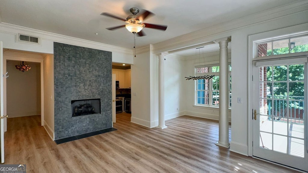 Here's your opportunity to own one of the most desirable corner units at Cotting Court, an iconic brick residence just steps from Peachtree Street. This boutique mid-rise offers luxury amenities including a 24-hour concierge, fitness center, lap pool, secure garage parking, and private balconies. Flooded with natural light, this rare corner home features expansive windows and rich LVP floors throughout the main living areas. The open-concept layout is anchored by a cozy gas fireplace, while the adjacent dining area includes remote-controlled lighting for added ambiance. The kitchen blends style and function with custom white cabinetry, stainless steel appliances, and a designer tile backsplash. The spacious primary suite includes a walk-in closet and a luxurious en-suite bath with double vanities, a soaking tub, and a separate tiled shower. A stylish, space-saving guest bath adds to the unit's smart design and urban appeal. Step outside to your private balcony or take advantage of the many perks this unit offers, including trash disposal just down the hall, convenient stair access for pet owners or joggers, and a sixth-floor resident patio with skyline views. Cotting Court's prime location puts you near Piedmont Park, the Beltline, The Fox Theatre, Publix, Whole Foods, Georgia Tech, and Midtown's top dining. Bonus: Cotting Court has made its mark on the silver screen, featured in productions like Marvel's Ms. Marvel, Shazam, and The Amazing Race, a nod to its cinematic charm and historic surroundings near the Margaret Mitchell House.