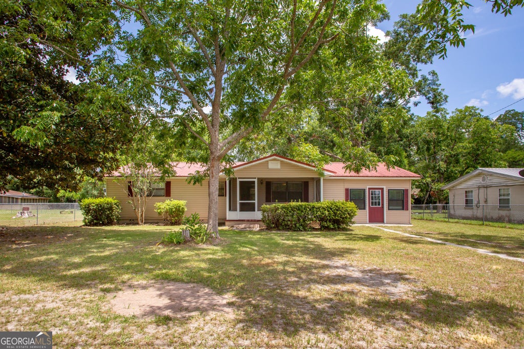 This is a charming single-story 3-bedroom, 1.5-bath home with a welcoming front porch and great curb appeal. The house features a red metal roof and light-colored vinyl siding with contrasting burgundy shutters and trim. This house was recently remolded with new paint and new flooring throughout. A screened-in front entry offers a cozy spot to enjoy the outdoors, while mature trees provide shade in the spacious front yard. Well-maintained shrubbery lines the front of the home, and a fenced backyard can be seen to the left, making it ideal for pets or outdoor activities. The additional side entrance with double doors could be a bonus room or potential office space. Overall, it's a comfortable, well-kept home with plenty of outdoor space and potential.
