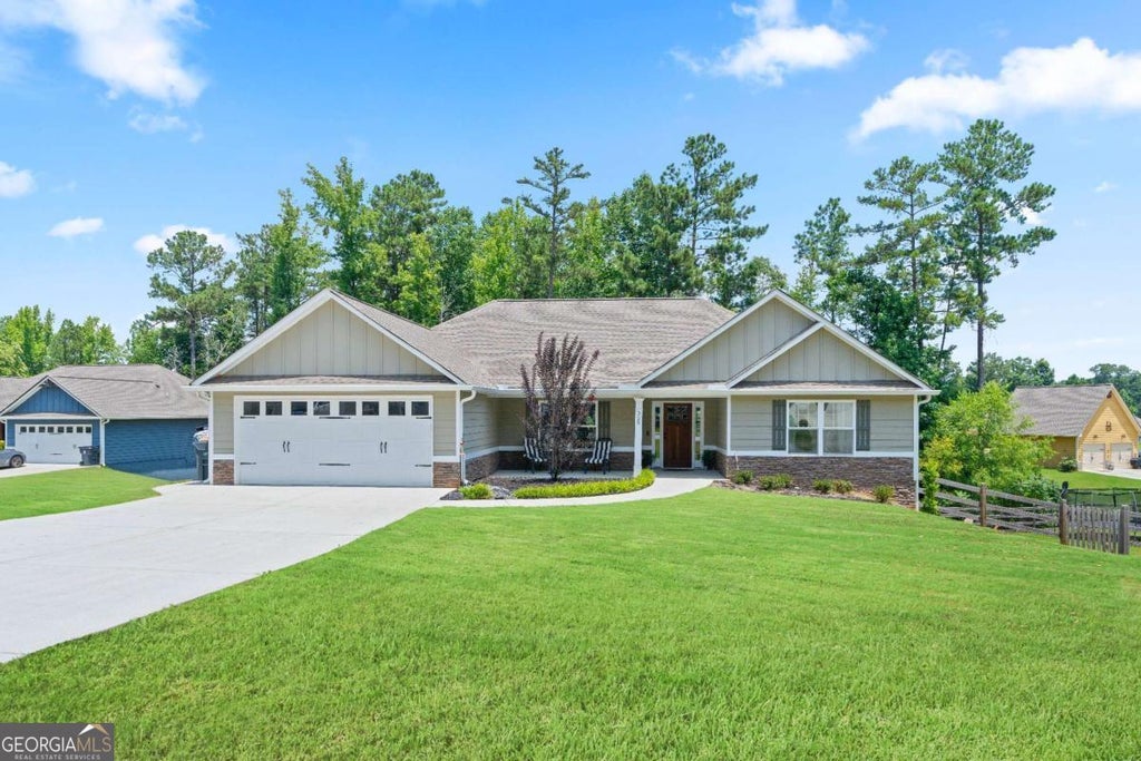 Where Can You Find A House Like This, For A Price Like This, In A Community Like This? Right Here! This Super Cute And Very Well Maintained House Is Located In Harlan Trace Subdivision. No HOA. A Cul-Du-Sac, In A Relaxed Community. Craftsman - Style Ranch offers 3 bedrooms and 2 bathrooms, spacious open floorplan, a separate dining room, a family room with stacked stone fireplace and a Chef's kitchen with stainless steel appliances, granite counter tops with a large island. Primary Suite includes double vanity, 6ft tile shower and his and hers walk in closet. The secondary bedrooms on the other side provide flexibility for children and guest. The perks don't stop inside a very spacious covered deck overlooking big, beautiful back yard. With above ground saltwater pool and deck, firepit and TV already installed on wall. Great Environment for Entertaining Family and Friends.