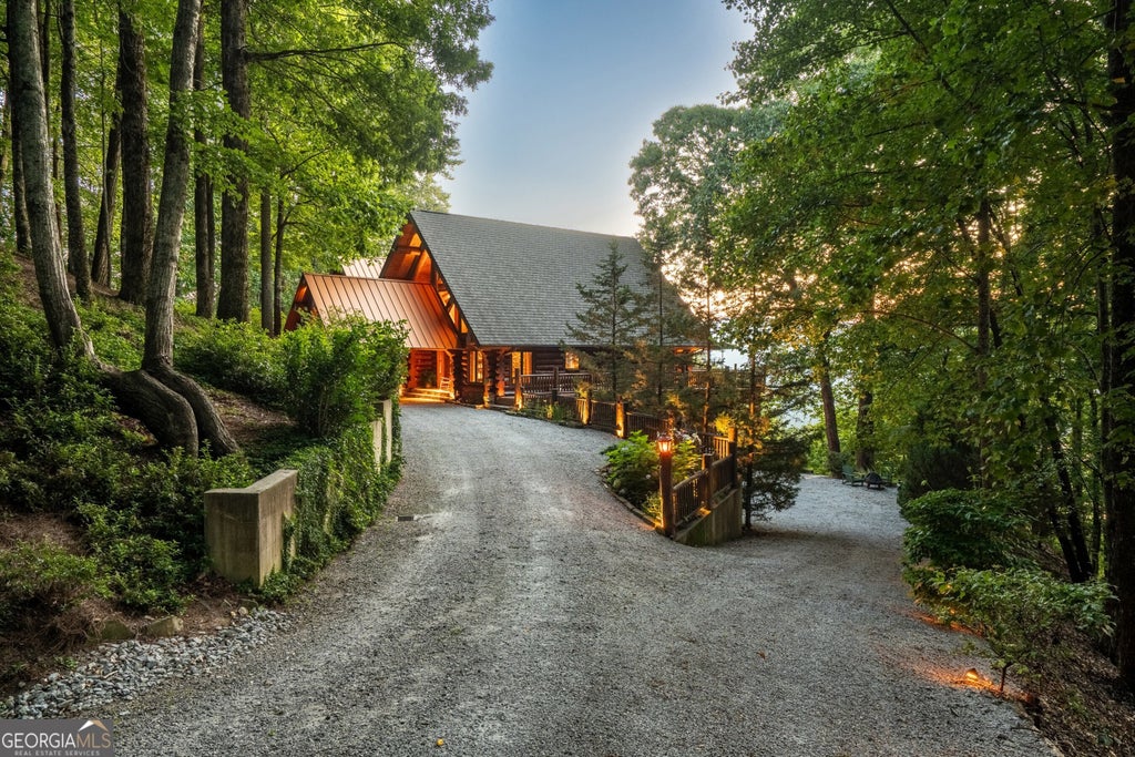 Perched on Charlie Mountain with breathtaking sunset views overlooking Lake Burton and surrounded by the serenity of the Blue Ridge Mountains, this luxury custom log home blends timeless craftsmanship with modern comfort and an ever changing visual landscape. Built from authentic hand-hewn logs, the home showcases vaulted ceilings, pine floors, and a masonry stone fireplace that anchors the open-concept great room. Expansive windows frame stunning westward-facing views over Lake Burton, offering long range views that become the backdrop of your daily life. The gourmet kitchen is perfectly positioned for entertaining, with warm custom mission-style cabinetry, premium appliances, and a seamless flow to the dining and outdoor living areas. Whether hosting friends and family on the expansive deck enjoying the views or savoring a quiet morning with coffee or tea under the protected cover of the large eaves, the setting is unforgettable. With 4-bedrooms and 3.5-bathrooms, this retreat is designed for those who seek both elevated living and ample space to unwind. Two generously sized bedrooms with a shared bath upstairs provide comfort and privacy for family and guests. The luxurious primary suite is located on the main level with private deck access, a spa-like ensuite bath, walk-in closet and a dedicated home office for those seeking a true live-work-play lifestyle. A fourth bedroom is located on the lower level in addition to a generously sized laundry room, a flex space currently used as an art studio, a secondary living area with wet bar, ample storage room and access to the terrace level patio and drive under garage/workshop. The exterior of the home offers a grand log porte cochere front entry, mature, intentional landscaping, and ample parking. Tucked in the quiet, upscale enclave of Charlie Mountain just minutes from Anchorage Boat Dock, Waterfall Club, the amenities of thriving Downtown Clayton, and endless outdoor adventures, this property is an ideal second home, investment property, or full-time mountain escape.