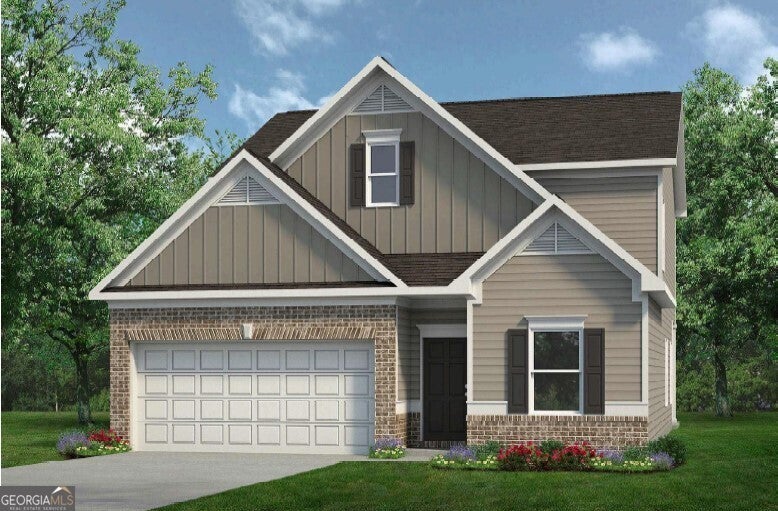 Move in Ready October 2025! The Caldwell plan, located in Garrett Preserve by Smith Douglas Homes! This home is a great choice for those needing a first floor Owner's Suite. The hub of this home is the centrally-located family room with a modern linear fireplace as the focal point. The adjacent kitchen is ideal for entertaining, the chef in the family doesn't miss a thing! Quartz countertops, upgraded 42" upper cabinets for extra storage this kitchen is a cook's dream! Grilling is ideal on the covered rear patio and a separate dining room is perfect for more formal gatherings. The laundry room is convenient and just steps away from the primary suite that is highlighted with a tray ceiling. Vinyl plank flooring throughout the main living area offers a seamless transition from room to room. The second floor has two guest bedrooms, a shared full bath and a loft. Both stories have Smith Douglas Homes signature 9ft ceiling heights. Photos representative of plan not of actual home being built. Seller incentives with use of preferred lender.