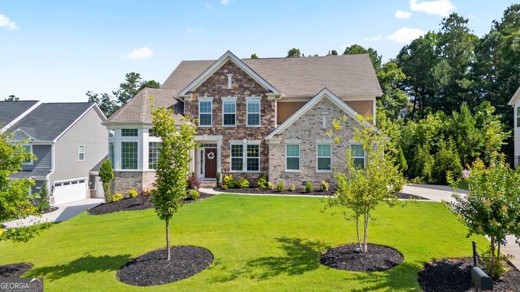 Welcome to this distinguished residence in the highly sought-after conservation community of Governor's Preserve. Surrounded by the Etowah River, and nestled on a cul-de-sac lot backing to protected greenspace, this property is the perfect retreat. Showcasing a stately brick and stone fa ade, this home offers a light-filled interior with elegant finishes, including a private sitting room with panoramic bay windows, a spacious formal dining room, and a gourmet kitchen with a large island, designer lighting, stainless steel appliances, and access to the grilling deck. The open-concept layout centers around a fireside great room, while a bright home office, pantry, mudroom, and custom laundry room complete the main level. Upstairs, the luxurious primary suite features a sitting area with a double-sided fireplace, spa-like bath with dual vanities and walk-in closets, soaking tub, and tiled shower. Three additional bedrooms offer en-suite or shared baths, and the partially finished terrace level includes a media/rec room, full bath, and room to expand. Enjoy outdoor living with a covered patio, lush landscaping, and a nearly new hot tub in the fenced backyard. The oversized two-car garage includes a new EV charging station, and community amenities abound with a resort-style pool, waterslide, tennis courts, playground, clubhouse, and 7 miles of hiking trails- all within an award-winning school district.
