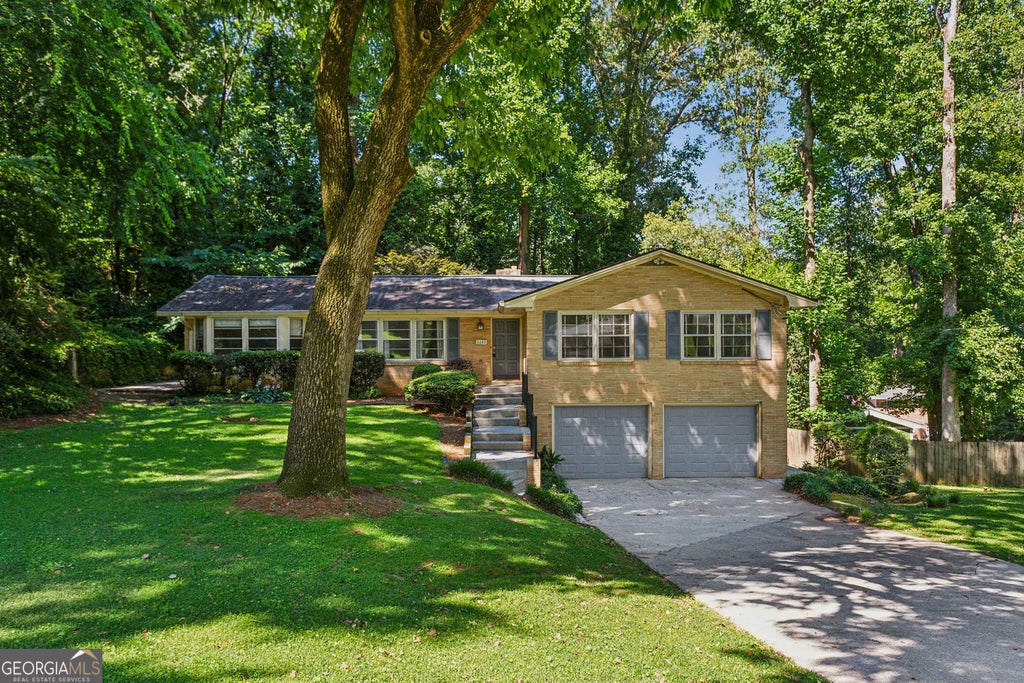 Great opportunity in popular Embry Hills neighborhood in Lakeside High School district! Nestled in a wooded setting with large front yard, this four-sided brick ranch style home is ready for renovation. Large light filled Living Room adjoins separate Dining Room. The spacious kitchen with stainless appliances is open to Family room with fireplace. Primary Bedroom has a private updated bath with walk-in shower. Secondary tile bath is in the hallway. Three bedrooms on the main. Hardwood floors throughout the home are ready for refinishing. Laundry room is located on lower level. A separate home office on terrace level as well. Updated systems include HVAC (2021) and H20 heater (2023). Roof less than 10 years. Huge unfinished basement. Two-car drive under garage. Priced to sell! Great location just minutes to Mercer, I-85/I-285. Close to popular Embry Hills Club for swim, tennis, volleyball and year-round social events. Property sold 'As is'.
