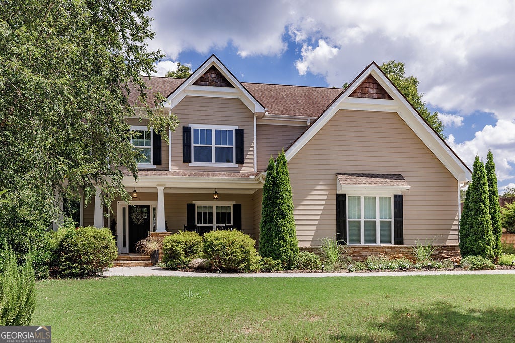 Welcome to this beautiful, meticulously maintained home in the cozy Hearthstone community - ready for you to move in and make it your own. As you enter the foyer of this charming craftsman-style residence, you immediately feel a sense of warmth and love. The spacious open-concept living room greets you with stunning exposed beams, gleaming hardwood floors, and a gorgeous stone fireplace, creating the perfect gathering space. To your right, you'll find a kitchen that any chef will adore. Featuring abundant counter and cabinet space, a massive island, elegant lighting, stainless steel appliances, and a large pantry, this kitchen is both functional and stylish. Upstairs, the expansive primary suite offers plenty of room for all your furniture, along with a walk-in closet featuring custom storage solutions. The primary bathroom includes a large tiled walk-in shower and a double vanity for added luxury. One guest room enjoys its own private full bathroom, while the other two guest rooms - one of which is oversized - share a third bathroom. These versatile rooms can be used as bedrooms, office spaces, or playrooms to suit all your needs. Step outside to enjoy one of the home's highlights: a covered back patio overlooking the large backyard. The outdoor space features professional grading and stonework, creating a peaceful retreat, as well as an additional storage building and greenhouse for your hobbies or gardening projects. The two-car garage is equipped with durable epoxy flooring and offers ample storage with organizational cubbies - perfect for household items, sports gear, and DIY tools. This wonderful property is ready to become someone's dream home - don't miss your chance to make it yours!