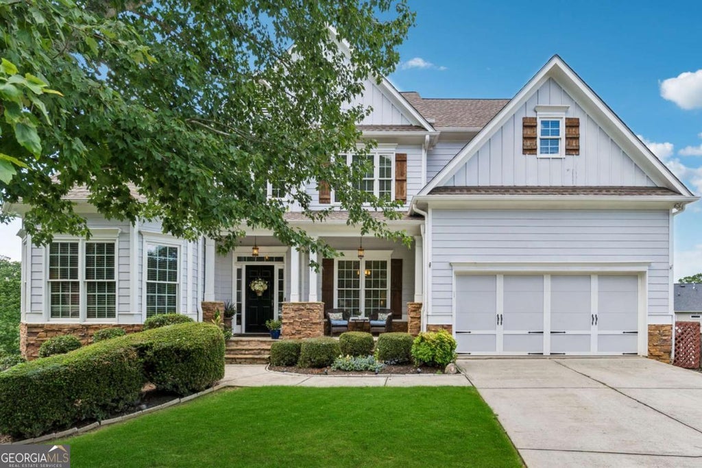 Welcome to the Hampton home that truly has it all. Perfectly situated in a quiet cul-de-sac on a generous, fenced lot, this home offers stunning mountain views, three fully finished levels, and a lifestyle that blends comfort, elegance, and functionality. Step inside to a sun-soaked interior with fresh paint, new carpet, and an open layout designed to impress. The two-story family room showcases a dramatic wall of windows, a stacked-stone fireplace, built-in cabinetry, and wide-open views of the backyard and distant ridgelines. The kitchen features granite countertops, stainless steel appliances, a center island, and a seamless flow into the main living space. The primary suite on the main level is a peaceful retreat with a tray ceiling, large windows, and an oversized en-suite bath. Upstairs, you'll find additional bedrooms and flexible space perfect for guests or home offices. Downstairs, the finished terrace level adds even more value with a full bedroom and bath, large rec room, potential 6th bedroom or office, and a bar area with sink and dishwasher, ready for a full 2nd kitchen-ideal for multi-generational living, a teen suite, or future rental income. Direct access to the lower patio and backyard makes it as practical as it is private. Outside, enjoy grilling on the back deck, sipping coffee with a sunrise, or playing ball in the awesome yard. The oversized lot backs to mature trees and offers room to breathe while being just seconds from GA 400, top-rated schools, and everything North Forsyth has to offer. All of this comes with resort-style amenities including a championship golf course, swim/tennis/pickleball, trails, clubhouse, and even a community dock on the pond.