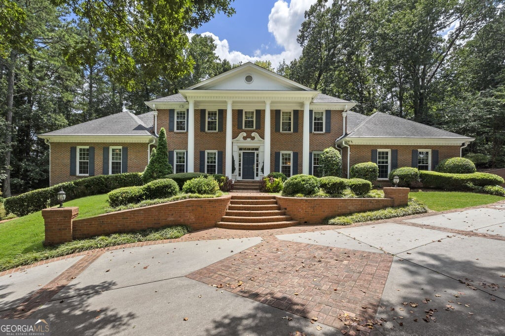 This elegant gated estate rests on 2.23 manicured acres in the heart of Sandy Springs, offering exceptional privacy, architectural sophistication, and an abundance of living space both inside and out. A long, landscaped driveway leads to a grand brick facade with classic columns. The grand double doors welcome you into a breathtaking two-story foyer featuring polished marble floors and a sweeping staircase. To the left, the formal living room invites conversation with its fireplace and abundant natural light, while across the foyer the formal dining room exudes elegance with marble flooring and a mirrored feature wall. The richly paneled den, accented by coffered ceilings and a fireplace, offers a warm and refined space for quiet reading or intimate gatherings. Nearby, a solarium with floor-to-ceiling windows and an antique fountain opens into an expansive media and entertainment room, complete with built-in cabinetry, a retractable awning, surround sound, and dramatic Palladian-style windows that flood the space with light. The heart of the home lies in the gourmet kitchen, with white custom cabinetry, porcelain tile flooring, stainless steel appliances including a built-in steamer, tile backsplash, and off-white Corian countertops. A spacious breakfast room and adjacent sunroom provide stunning views of the backyard, creating a peaceful setting for daily living. The main level also features a large primary suite with dual oversized closets and a private en suite bath, ideal for guests. Upstairs, the luxurious secondary primary suite is a true retreat, highlighted by a lighted double tray ceiling, spa-inspired bath with dual vanities, a jacuzzi tub, and a custom-designed oversized closet. Additional upstairs bedrooms are generously sized and share well-appointed baths, offering comfort and privacy for family and guests. The finished terrace level expands the home's living space with a versatile layout that includes a home office, a full bath, a wet bar, a game area, and direct access to a covered patio. Just off the terrace level, there's ample space to add a custom pool, allowing seamless indoor-outdoor entertaining. On the opposite side of the storage building, there's room for a tennis court or handball court, adding even more recreational possibilities to the estate. Several levels throughout the home and grounds can comfortably host mixed indoor-outdoor gatherings of over 100 people, making it ideal for entertaining on a grand scale. The grounds are equally impressive, featuring brick paver pathways, manicured lawns, classical statues, multiple fountains, and a built-in gas grill-perfect for al fresco entertaining. The guest house features its own three-car garage, providing private accommodations that include a living space with a kitchen, a full bathroom, and a bedroom. This arrangement increases the total garage capacity to five cars. This one-of-a-kind estate offers timeless craftsmanship, thoughtful updates, and premier amenities in one of Sandy Springs' most sought-after neighborhoods.