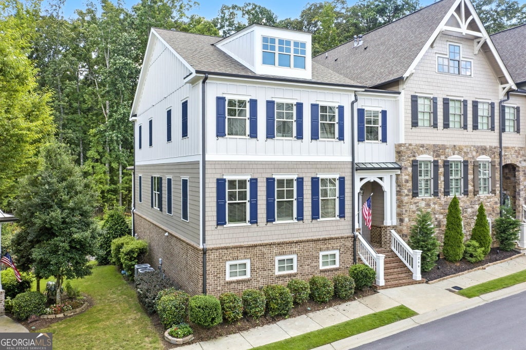 Stunning Executive end-unit Townhome in Overlook at Sixes offering a turnkey lifestyle with an elevator to all three levels and serene green space views from the screened porch. The exterior blends brick, board and batten, and shake, leading to a welcoming foyer and open floor plan with hardwood floors, crown molding, and custom trim. The Great Room features a coffered ceiling, stone fireplace, and built-ins, flowing into the dining room with shiplap accents. The gourmet kitchen boasts white cabinetry, stone countertops, farm sink, oversized island, stainless appliances, gas cooktop, Rev-A-Shelf pull-outs, and a walk-in pantry/dry room. Kitchen also has large keeping room with fireplace. Upstairs, the primary suite offers two custom walk-in closets and a spa-like bath, plus two secondary bedrooms and a loft. The finished terrace level includes wainscoting, a Murphy bed, and abundant storage. Notable upgrades include faux brick accents, wooden registers, wainscoting in baths, epoxy garage floor with fans, insulated oversized garage doors, custom outdoor lighting, Ring doorbell, Schlage keypad, Nest thermostats (4-zone with humidifier), laundry room with cabinets, sink, and in-wall ironing board, new exterior paint, roof wash, and newer AC coil with all systems serviced. Community amenities include a clubhouse, fitness center, and pool, with optional BridgeMill Athletic Club membership for golf, tennis, pickleball, and more. Minutes to Lake Allatoona, shopping, and dining.