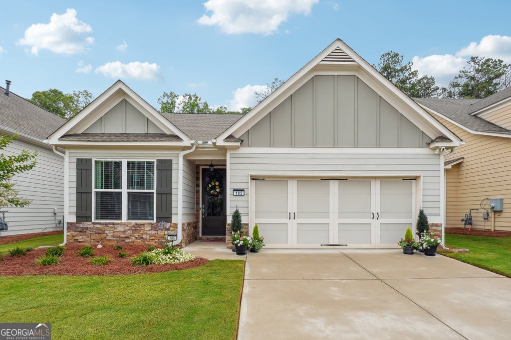 Welcome to this beautifully appointed 3 bedroom, 2 bath, single-level home in the highly sought-after NatureWalk active adult section of a vibrant, amenity-rich community. Blending comfort, style, and low-maintenance living, this home boasts rich hardwood floors, crown molding, and tasteful designer accents throughout. The open-concept layout is light-filled and inviting, anchored by a spacious great room with a cozy gas fireplace and upgraded lighting. The chef's kitchen is a showstopper-featuring pristine white cabinetry, granite countertops, stainless steel appliances, a walk-in pantry, and elegant finishes that flow seamlessly into the dining and living areas. The primary suite is a true retreat, complete with a tray ceiling, two walk-in closets, and a spa-like bath offering dual vanities, a tiled shower, and beautiful tile flooring. A laundry/mud room with a built-in drop-zone bench adds everyday convenience, while two additional bedrooms provide flexible space for guests, an office, or hobbies.Step outside to a private, fenced backyard where a covered porch with a stunning stone fireplace overlooks peaceful wooded views-the perfect setting for relaxing or entertaining year-round. A two car garage, professional landscaping and exceptional curb appeal complete the package. Residents enjoy a low-maintenance lifestyle with lawn care, trash service and a full calendar of planned social events included. Community amenities abound-clubhouse, walking trails, golf cart paths, dog park, junior Olympic pool, pickleball and tennis courts, basketball courts, and a full-time lifestyle director. This is more than a home-it's a lifestyle you'll love coming back to every day.