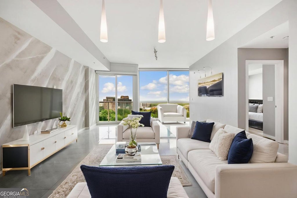 Perched high above the city on the 18th floor of the iconic Terminus building, this sophisticated 2-bedroom, 2-bath corner residence captures the very best of Buckhead living, showcasing sweeping, unobstructed views that stretch from Truist Park to the sparkling Downtown Atlanta skyline. Walls of floor-to-ceiling glass flood the home with natural light during the day and transform the space into a dazzling panorama of city lights at night. Inside, refined finishes and a thoughtfully planned layout balance elegance with everyday comfort. The chef's kitchen is a true centerpiece, outfitted with Sub-Zero and Wolf appliances, granite countertops, custom cabinetry, and a gas cooktop-perfect for both entertaining and casual dining. The open-concept design offers flexible living, easily accommodating a dining area, home office, or cozy media space-all while taking in breathtaking views. The primary suite provides a serene retreat with dual walk-in closets and a spa-like bath, while the spacious secondary bedroom includes an en-suite bath and generous closet space. Additional features include a dedicated laundry closet with washer and dryer, a tankless water heater, and two secure parking spaces. Terminus residents enjoy an unmatched collection of amenities, including a saltwater pool and hot tub, landscaped terrace, state-of-the-art fitness center, massage room, clubroom, game lounge, guest suite, and private pet walk-all supported by 24-hour concierge, valet, and on-site security for a true lock-and-leave lifestyle. Situated in the heart of Buckhead's vibrant corridor, you're just steps from Atlanta's finest dining, shopping, and nightlife, with effortless access to MARTA and major highways. Experience life above it all-this is more than a home, it's a lifestyle. Welcome to Terminus.