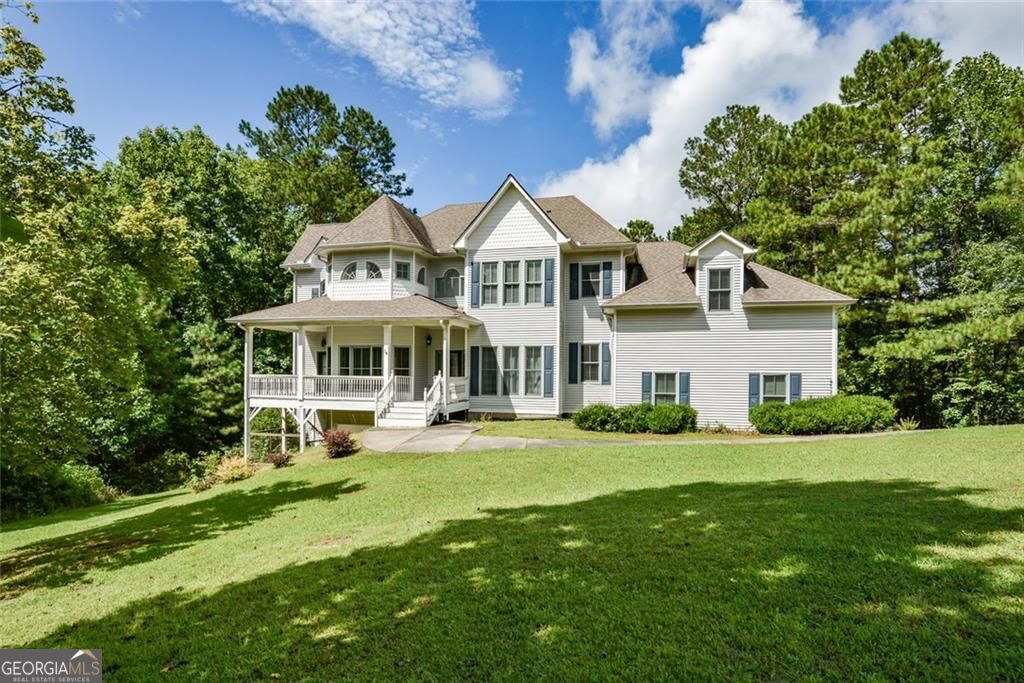 Southern charm meets modern living! This 4-bedroom, 3 full/2 half bath home on 4.3+ private acres offers wraparound covered porches, timeless curb appeal, and a thoughtful floor plan designed for comfort and style. Inside, hardwood floors flow from the foyer to a formal dining room and a flex room with custom moldings. The living room features a cozy fireplace with a wood shiplap accent wall, opening to a gourmet kitchen with granite countertops, stainless steel appliances, tile floors, tile backsplash, walk-in pantry, raised bar seating, and a gas range. A bay-window breakfast nook overlooks the backyard, and French doors lead to an expansive back deck. The mudroom off the 3-car garage includes a custom bench, built-in storage, and utility sink. Upstairs, the primary suite boasts a fireplace, private balcony, huge walk-in closet, and a spa-style bath with French doors, double vanities, a garden tub, and a double-headed custom tile shower. Two bedrooms share a Jack-and-Jill bath, and the fourth bedroom is an expansive, versatile space-perfect for a media room, playroom, home gym, or retreat. The full, partially finished basement is stubbed for a bath with a sink and commode already in place, plus a boat door, utility sink, and space ideal for a workshop or boat/golf cart parking. From here, step out to the covered terrace-level patio and fenced backyard. Privacy, versatility, and Southern style await-prime location with nearby conveniences.