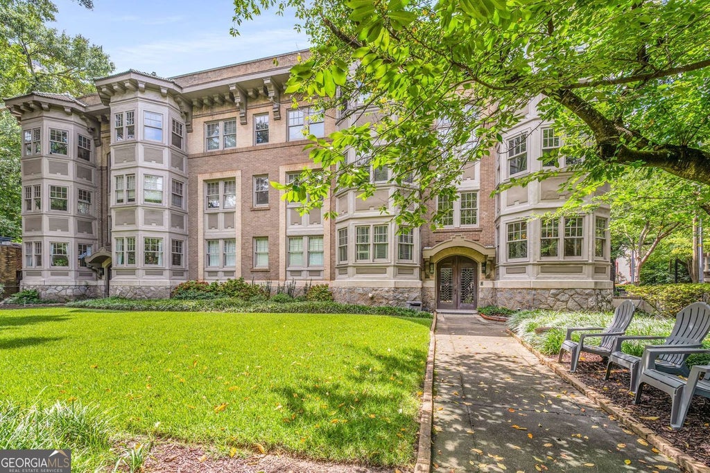 Welcome to Piedmont Hall, a beautiful building dating 1942. Sophisticated and lovely, this jewel overlooks the 14th Street entrance to Piedmont Park. Unit A4 has been very well maintained with gorgeous hardwood floors, very heavy trim/moulding throughout and high ceilings. There is a large Living Room that has a 'sunroom' with a view of the front lawn and the Piedmont Park entrance gates. Living room adjoins the generous sized dining room. The kitchen has stained cabinets, stainless steel appliances and stone countertops. 2 bedrooms and 2 full baths and an additional storage unit in the basement. 1 assigned parking space in the gated parking lot behind the building. This condominium is in an ideal location with everything that Midtown has to offer. Walkable to shopping, restaurants, the High Museum, the Atlanta Botanical Gardens, and of course Piedmont Park!