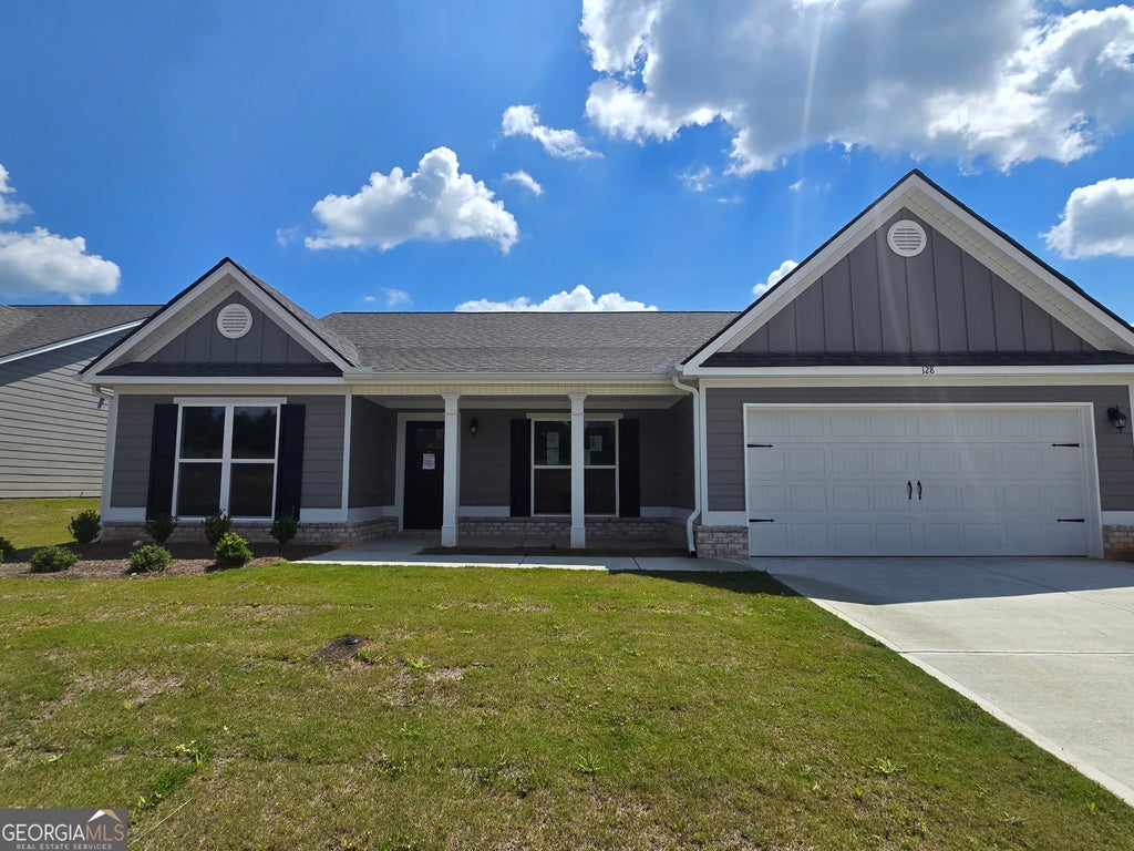 Craftsman style ranch, 4 bedroom, 2 1/2 bath, rocking chair front porch, concrete siding with brick accent, patio, open floor plan, kitchen has custom white cabinets, pantry, granite kitchen countertops, wood burning brick accent fireplace, separate dining area, master suite has walk in closet, master bath has separate shower and garden tub, double vanity, 2 car garage, Dogwood Plan, home is complete, SELLER IS OFFERING WITH FULL PRICE OFFER AND USE OF THE PREFERRED LENDER $10000 credit towards closing costs, interest rate buydown FHA 5.5 Fixed rate for 30 years, 6ft wooden rear yard privacy fence, 2 inch faux blinds, garage door opener, master shower door, side/ side refrigerator to qualifying buyers.Preferred lender $10000 1st time home buyer credit program available to qualifying buyers.