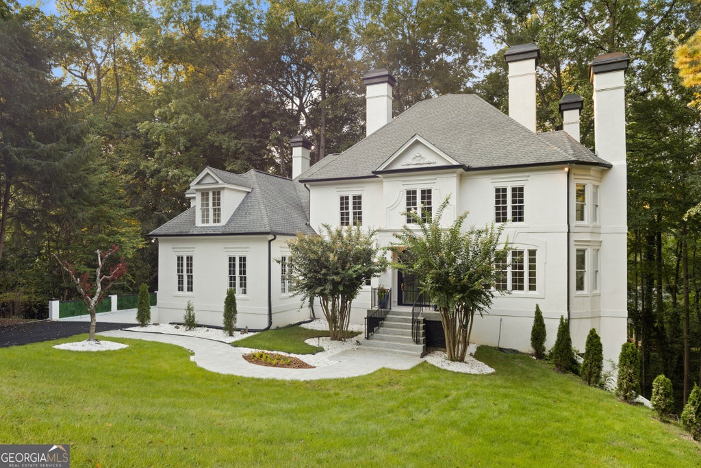 Welcome to Belle Vie, a private French eclectic estate set on a quiet cul-de-sac just 15 minutes from Buckhead and Atlanta's best dining, shopping, and culture. Designed for both grand entertaining and everyday living, this home blends classic elegance with modern convenience. Perched above a wooded valley with a natural stream, every level of the home offers serene, year-round views. A glass-and-iron entry framed by gas lanterns sets the tone for the craftsmanship within. The chef's kitchen is the centerpiece, with marble counters, custom cabinetry, and professional-grade appliances opening seamlessly into a vaulted great room with exposed beams and chandeliers. Upstairs, four spacious bedrooms and three full baths provide comfort and privacy. The terrace level transforms into a resort-style escape-featuring a temperature-controlled wine cellar, sauna, theatre, full bar, and game lounge-perfect for hosting or unwinding. An additional guest suite with a full bath completes the space.