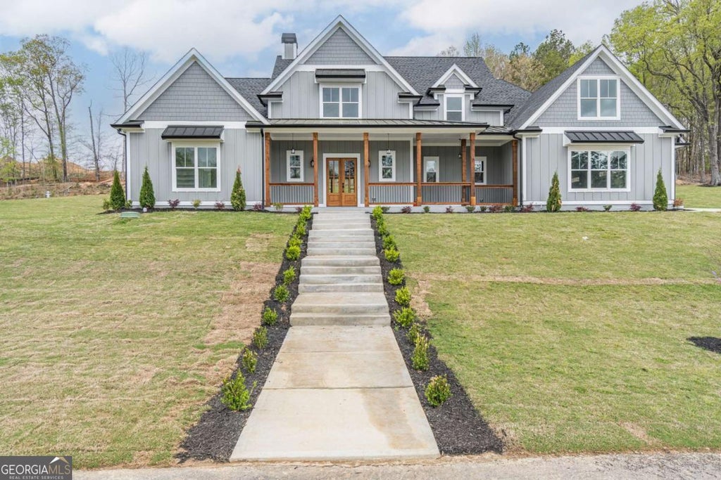Amazing modern farmhouse on beautiful 1 acre lot. Enjoy serene views from your front porch while relaxing in a rocking chair. Large open floor plan with lots of windows allowing natural light and views of nature. Large kitchen and oversized kitchen island create an amazing space for making great family meals and memories. Hardwood floors throught your main level, oversized master on the main, large bathroom with double vanity, rain shower and soaking tub. Spacious closet leads to laundry room. Four oversized secondary bathrooms each with the direct acces to a bathroom and extra large bonus room that can double as a play room office space, play room or anything you decide to make it. A true 3 car garage large enough to fit 3 SUVs or 3 pickup trucks, posibilities are endless here. You will also love living at Homestead at Hog Mountain, this new community will feature walking trails, club house, pool, community pub and food court and so much more. This is really the place you want to call home.