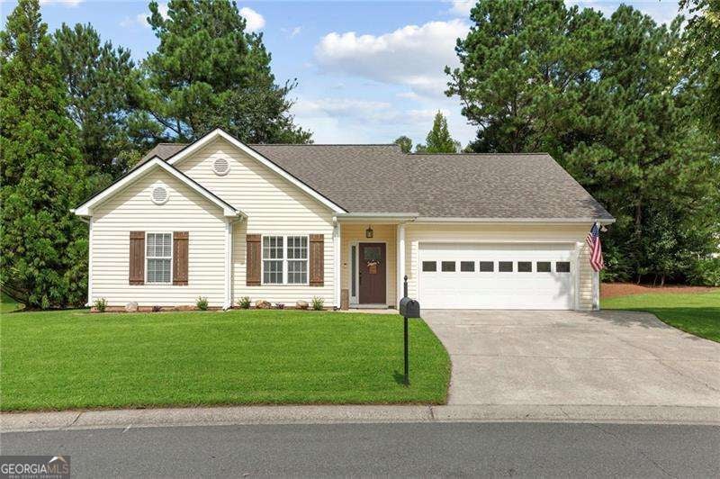 Welcome to this meticulously maintained RANCH home in PRIME location between Holly Springs and Hickory Flat! Walk inside through the new front door and be welcomed by beautiful custom trim and rustic wooden beam in the foyer! Continue into the open-concept living room with high, vaulted ceilings, gorgeous brick fireplace with custom wood mantle, and tons of natural light! The kitchen features newer, stainless steel appliances, ample storage, and breakfast nook with views to private, landscaped backyard! Cute accent doors in kitchen open to laundry room with extra-large washer and dryer included with sale! Large, two-car garage includes built-in shelving and pull down attic stairs with lots of storage space in attic! The primary bedroom features a tray ceiling and en suite bathroom with large soaking tub/shower combo! Updated mirrors, hardware, trim, and lighting creates a sophisticated feel down to every detail! Walk out to the serene back patio featuring a custom sail and new privacy fence - perfect for entertaining, reading a book, or grilling on the weekends! NEW ROOF, NO HOA, and LARGE CORNER LOT in the sought-after Sequoyah High School District! AMAZING LOCATION - 7 miles to Downtown Woodstock, 8 miles to Downtown Canton, 16 miles to Downtown Alpharetta, 26 miles to The Battery, and LESS than TWO miles to upcoming Downtown Holly Springs - featuring shops, restaurants, and amphitheater currently under construction! This charming Canton home is truly one of a kind!