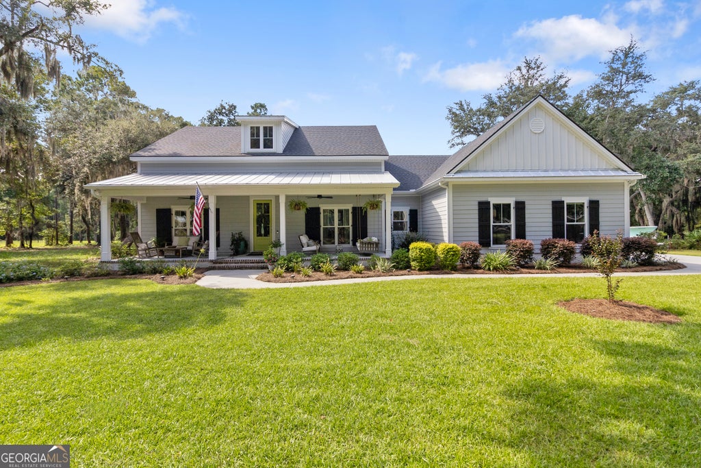 PRICE ADJUSTMENT! Welcome to effortless Lowcountry living! This better than new custom 2022 single-level home rests along the fairway of Sapelo Hammock Golf Club inside the double gated Sutherland Bluff Plantation, where coastal beauty and Southern hospitality abound. Thoughtfully designed, the open-concept layout combines modern convenience with timeless style. The kitchen showcases sleek cabinetry, stainless appliances, a gas stove, and a large island that flows into the dining area and living room. Anchored by a gas fireplace framed with custom built-ins, the living room offers both warmth and timeless Lowcountry style, while large windows throughout the home fill it with natural light and peaceful golf course views. Automated lighting and blinds, easily controlled by touch or Alexa, add comfort and ease. The split floor plan offers two spacious guest suites with private baths, plus a convenient half bath for visitors. The primary suite is a true retreat with tranquil views, spa-inspired bath featuring a soaking tub, oversized dual-head shower, double vanities, and a boutique-style walk-in closet with chandelier and center island. High ceilings, designer finishes, and wide-plank flooring carry Southern elegance throughout. Outdoor living is at the heart of this home. The living room extends effortlessly outdoors through an expansive wall of sliding glass doors, opening to a huge screened back porch with full outdoor kitchen, dining, and lounge area. Evenings are best spent around the custom-built fire pit, where sunsets paint the sky. A side-entry two-car garage plus golf cart garage enhances curb appeal and provides practical storage. Whether sipping coffee on the patio or unwinding in the owner's suite, every detail reflects thoughtful design and quality craftsmanship. Low-maintenance extras include covered gutters with leaf guards, a whole-home water softener, and sprinkler system. Sutherland Bluff offers more than a home-it's a lifestyle. Stroll beneath ancient live oaks alive with coastal wildlife, take advantage of the community pool, fitness center, tennis courts, and walking trails, or launch from the deep-water dock on the Sapelo River. From here, a quick boat ride brings you to the Intracoastal Waterway and the unspoiled barrier islands of St. Catherine's, Blackbeard, and Sapelo. Conveniently located less than 15 minutes to I-95, about 30 minutes to Richmond Hill, 40 minutes to Brunswick, and under an hour to Savannah and Jacksonville airports, this home is as accessible as it is serene. Blending modern convenience with the grace of the Lowcountry, this home is perfect for those who want to entertain with ease, embrace the outdoors, and enjoy the charm of Shellman Bluff.