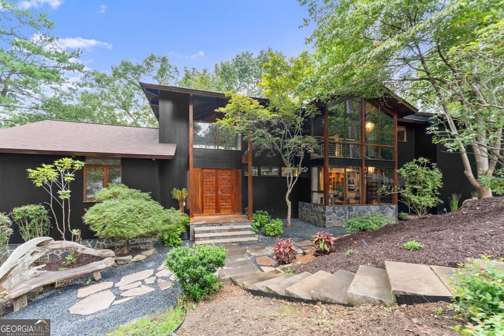 Tucked quietly behind the trees, this architectural gem was designed in the spirit of California Modernism-an ethos of bringing the outside in. Every line of its design blurs the boundary between home and nature: stone and wood accents anchor the residence, walls of glass dissolve into views, and each room was crafted to offer either tranquility, a connection to the outdoors, or a seamless step onto one of three expansive terraces. Even the gym is extraordinary, built with an in-situ boulder that grounds the space in organic architecture. This is a home that breathes. The intentional landscaping protects the residence while allowing both front and back doors to remain open, creating a natural flow of air throughout the interior-minimizing the need for central A/C. On the lower level, a private path leads to your 350 ft of water frontage on the Chattahoochee River, where you can enjoy kayaking, fishing and so much more. Along the way, you pass a cascading waterfall, its sound echoing up to the back deck where evenings are spent listening to water, wind, and birdsong as the sun slips below the trees. Over $250K in thoughtful upgrades elevate this residence for luxury living. A chef's kitchen boasts quartz counters, Viking appliances, and custom finishes, while the bathrooms have been beautifully renovated. New flooring, siding, decks, fixtures, and a garage door ensure both style and peace of mind. The terrace level offers a complete in-law suite with its own kitchen and living room, while the upper floor becomes a full master retreat-an entire level designed for rest and renewal. Set on 1.27 acres, the home balances space, privacy, and refinement in equal measure. Set within Sandy Springs' exclusive Grogans Bluff, this 6-bed, 4.5-bath with a bonus room places you in a swim/tennis community while keeping you moments from the city's best dining, shopping, and outdoor adventure. This is more than a residence-it is a rare piece of living architecture designed for harmony with its surroundings.