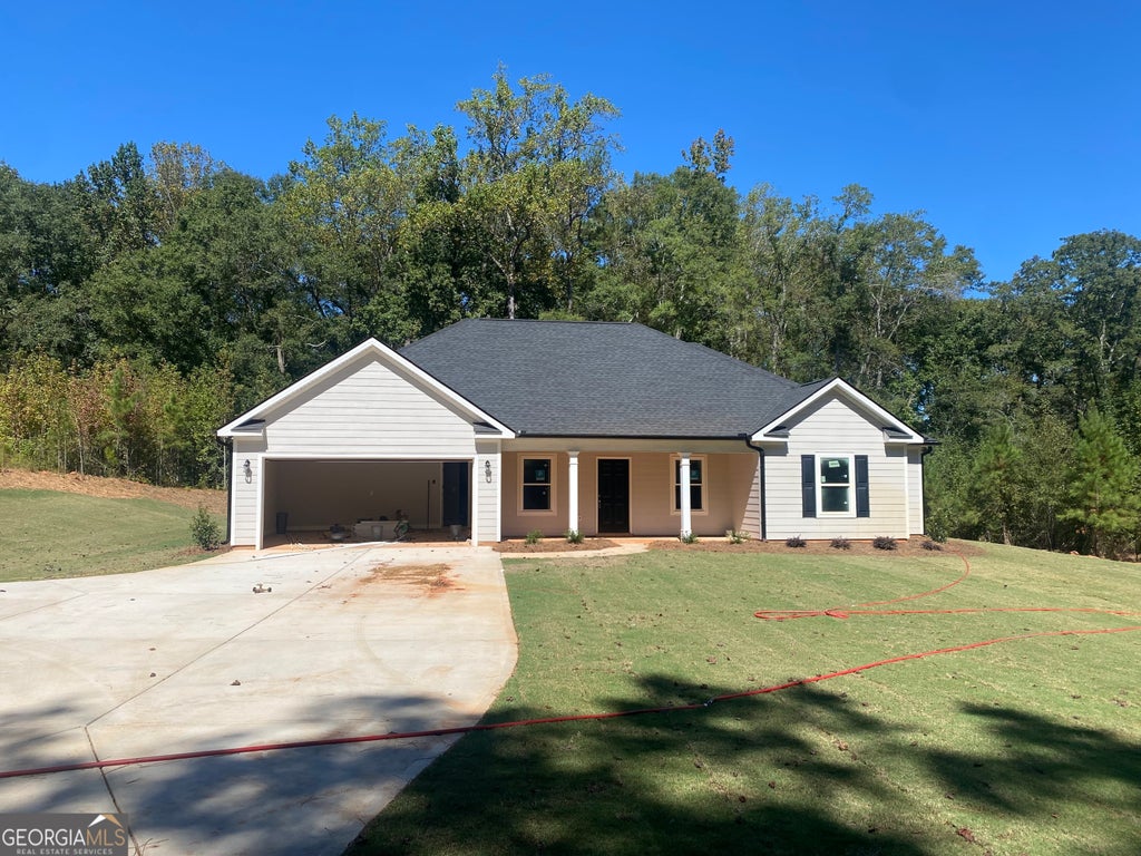 New construction ranch in rural Upson County/Yatesville on a beautiful 3.1 +/- acre lot away from it all! Offering 4 bedrooms and 2 full baths in a one story ranch floorplan, the home features all 4 bedrooms on the main level in a split bedroom plan. Living areas include a family room, designated formal dining area, and a nice island kitchen, all in an open floorplan for easy living and gathering! The kitchen features stainless steel appliances, real wood kitchen cabinetry with soft close hinges, a great island with storage and built in trash cans, and granite countertops. Great split bedroom layout with the primary suite on one side and a hall with the secondary beds and bathroom on the opposite side of the home. All secondary bedrooms feature walk-in closets and one bedroom has a vaulted ceiling! The primary suite features a vaulted ceiling, walk in closet, large vanity with granite countertop, linen closet, and oversized walk in full tile shower. Other features include a spacious laundry room, 2 car garage with automatic openers, LVP hardwood look flooring throughout, crown molding in the dining and family room, LED lighting throughout, and granite in the kitchen and both bathrooms. The exterior is constructed of sturdy Hardie siding and offers a lifetime architectural roof. Enjoy the peace and quiet from the covered front porch or overlook the yard and rear woods with a creek from the covered rear patio with ceiling fan. Both porches have with rustic wood planked ceilings. High speed fiber internet is available through Conexon! Quiet road with very little through traffic in a quiet part of Upson County just outside of downtown Yatesville. Very convenient to Hwy 74 for easy access to Thomaston, Forsyth, and Macon. Use the preferred lender and receive 1% of the loan amount back to use towards closing costs and/or interest rate buy down! Home can close within 30-40 days from time of list.