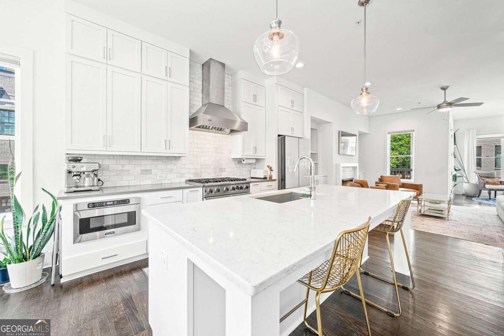 Welcome to 28th at Brookwood: walkable, intown, low maintenance luxury living in Atlanta's most desirable neighborhood. This is your opportunity to live in an immaculately maintained contemporary four-story end-unit townhome under a million dollars, with million dollar views and is the epitome of move-in ready. Don't sweat the stairs-you have your own elevator, which makes moving heavy furniture or decorations light work. The spacious open concept on the main floor is perfect for entertaining while at the same time three outdoor living spaces offer sanctuary retreats. Of course the kitchen has stainless steel Viking appliances, custom cabinets, quartz countertops/backsplash, and a massive island with ample storage. Connected to your kitchen is a powder room and the cozy living room with an elegant gas fireplace surrounded by custom built-ins. The living room flows directly into the gorgeous sunroom and convenient back deck. One story up is your spacious master suite, which includes everything you expect: pristine double vanity, seamless glass framed shower with rain shower head, and a custom closet. Convenient laundry access and an additional bedroom with full bath are just down the hall. The top floor is another show stopper, with two roof top terraces with skyline views, an outdoor gas fireplace outfitted for a TV for fall and winter movie nights. Inside you have another full bath, mini bar, and lounge for winding down after a long day. On the ground floor you have an attached 2-car garage and bedroom that can serve as a guest room or office with another private full bath. Located on a quiet street with ample guest parking, and you're just steps from Piedmont Hospital, the Northside Beltline Trail, both Ardmore Park and Tanyard Creek Park, shopping, restaurants, and quick access to I-75 and I-85.