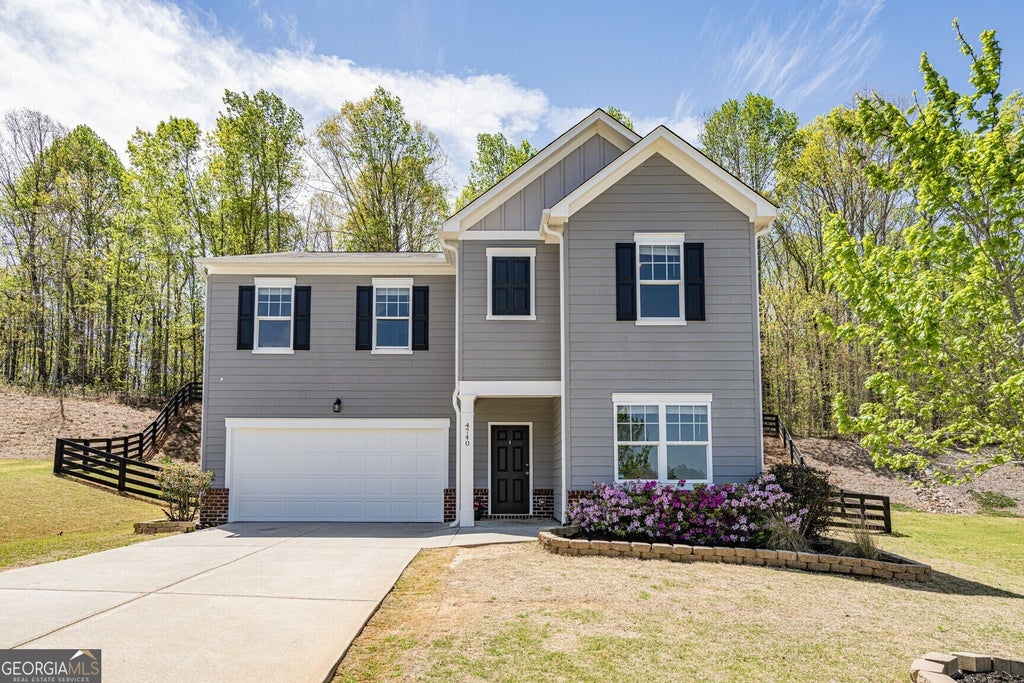 Welcome to this delightful 5-bedroom, 3-bathroom home that combines charm with modern convenience. Built just 5 years ago, this property still feels brand new. The house boasts fresh interior paint throughout and is nestled in a serene setting with a fully fenced backyard backing onto a natural wooded area ideal for privacy and relaxation. Step inside to discover a spacious open floor plan featuring a welcoming living area, breakfast nook, and a beautifully appointed kitchen with a large island and walk-in pantry. The main level also includes a versatile dining or sitting area, a convenient guest bedroom with a full bath, and easy access to a roomy two-car garage. Upstairs, you'll find a generous loft space, perfect for a playroom, home office, or additional lounge area. There are three well-sized secondary bedrooms, a large master suite complete with a walk-in closet, and a conveniently located upper-level laundry room with ample space for storage and organization. Situated just a short drive from Highway 400, this home offers effortless commuting and proximity to local amenities. Additionally, Lake Lanier's recreational opportunities are only a quick trip away. This home is truly a perfect fit for families, offering both functionality and a warm, inviting ambiance. Come and see what makes this property so special!
