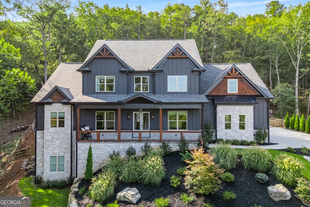 Perched on 1.78 private acres, this 2023 custom-built home brings together thoughtful design and modern luxury in an entertainer's dream setting. The heart of this estate is its outdoor space that boasts a 22,000 gallon heated gunite pool with spa and baja shelf. Covered porches with rocking chairs and overhead fans provide a retreat from the sun, while multiple TVs, soundbars, seating areas and fireplaces create a full entertainment experience. A creek runs along the side of the property, adding a natural soundtrack when it rains, and it's not uncommon to see deer pass through the front yard early in the mornings. From the west-facing front porch, enjoy colorful sunsets that turn each evening into a show of its own. With 4,018 finished square feet above grade and a 2,247 square foot walk-out basement (equipped with high ceilings and bath plumbing ready for completion), this property offers both sophistication and potential. The main floor features a chef's kitchen with black ZLINE appliances, stunning quartz countertops, and a walk-in pantry, opening to a two-story living room filled with natural light. A wood stove anchors the room, offering warmth and charm. Also on the main level: the primary suite with dual closets and a spa-like bath with soaking tub, plus a private office, walk-in laundry, and a guest bedroom with full bath. Upstairs, you'll find three additional ensuite bedrooms, an oversized theatre/bonus room with its own bath, and even a second walk-in laundry room for convenience. And for that extra touch of rustic comfort, knotty white pine wood flooring has been installed throughout the home. While peaceful and private, this property is just minutes from Publix, local schools, and Lake Allatoona. And just 0.3 miles down the road, Qualusi Vineyards offers tasty wine, beer taps, live music, food trucks, and weekend markets - a perfect neighborhood amenity! 161 Blossom Trail is more than a home-it's a retreat.