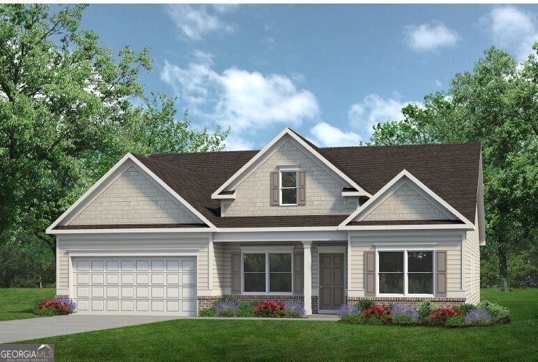 Move in Ready December! The Avery in Jones Ridge by Smith Douglas Homes. One of our best-selling single-story homes, offering three bedrooms and three full baths. A long extended entry foyer sets the tone, leading into expansive open-concept gathering spaces that are ideal for everyday living and entertaining. Private bedroom-especially the primary suite tucked at the rear of the home- provide a peaceful retreat. The primary suite showcases a tray ceiling, walk-in shower and access to the laundry room through the walk-in closet. The kitchen features quartz counters, upgraded 42" upper cabinetry and opens to a breakfast area and the family room where a linear fireplace creates a stunning focal point. Practical spaces are thoughtfully designed, with an expansive mudroom with trim detail at the garage entrance. Stylish luxury vinyl plank flooring flows through the main living areas, completing this wellplanned home. Nine ft ceiling heights enhance the spaciousness of the home. Seller incentive with the use of preferred lender. Photos representative of plan not of actual home.