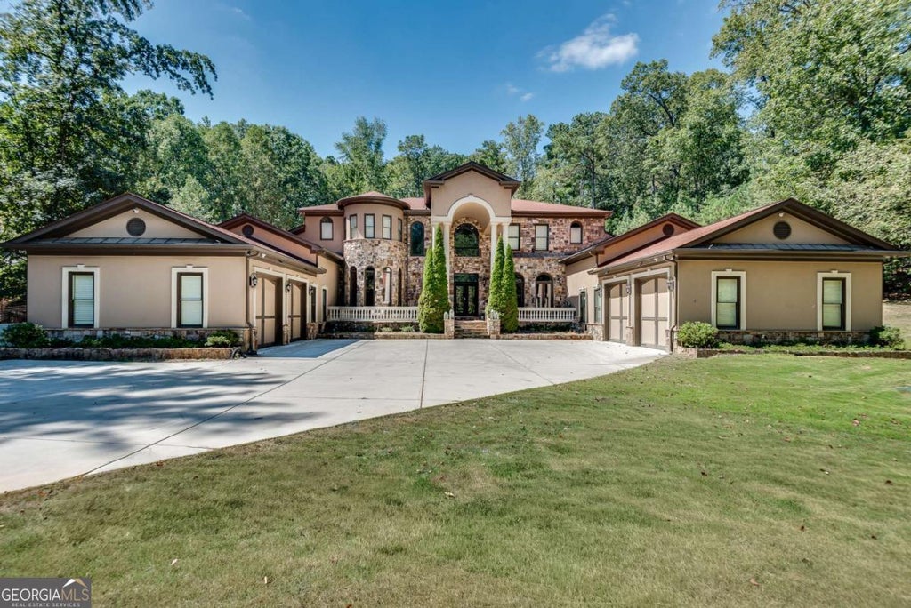 Stunning estate home on an acre in a small, luxury home community that's directly across from Kennesaw Mountain! This beauty is a true bargain, given all it has to offer. Travel the tree lined driveway to the security gate, before entering the courtyard, which is flanked by two, 2 car garages and parking spaces for two additional cars. Cross over the expansive front porch and enter through the wrought iron doorway into the two story foyer with its gorgeous, crystal chandelier. The great room, with its soaring, cathedral ceiling and wall of windows opens in front of you, offering a second chandelier, a fireplace and a view of the backyard pool, spa and patio. To your left is a full bar with seating at the stone countertop, custom shelving, an icemaker and a mini refrigerator, and is adjacent to a half bath. The bar looks out to the formal dining area, which rests in an alcove of curved, floor to ceiling windows. Beyond the bar and dining area is the expansive kitchen and keeping room. The kitchen includes tons of cabinetry and granite countertops, a huge island with lots of seating and a built in cooktop. The double ovens and double microwaves are a convenient way to hold dinner parties and holiday gatherings. The walk in pantry includes plenty of built in storage. The kitchen opens to the massive keeping room, with its floor to ceiling stone fireplace, wood plank ceiling, and patio access. The breakfast nook completes this lovely, family gathering space. Exit the kitchen and walk the hall down to the roomy bedroom and ensuite bath, perfect for visting guests or family members. Beyond this large living space is an adorable "pet palace", the laundry room with storage and counter space and the first two car garage. Cross to the other wing of the main level, passing a half bath and stately office, with wall to wall wood paneling. Continue down the hallway to a bonus room, perfect for a rec space or TV room, and the master beyond. The owner's suite is a true oasis and respite from long, busy days. The fireplace and sitting room allow you to spread out and realy relax. The ensuite master bath is just incredible. There is a second, built in laundry, two water closets, separate vanities with storage, a huge, soaking tub, double shower and a to die for master closet. This wing also offers access to the second, two car garage. Make your way back to the main living area and ascend the graceful, curved staircase to the upper level. On either side of the catwalk are two sets of bedrooms and two full baths. More space and function await below the main level. The basement is massive and includes a kitchen, two and a half baths, two bedrooms and several bonus rooms that are ideal for fitness, theater or play areas. The basement also offers access to the side yard and two stairways back to the main level. The pool and spa in the backyard is a prime spot for relaxation and fun on those hot summer days. The property itself sets on a full, tree surrounded acre and has the feel of a luxurious retreat. The location is perfect, with the Kennesaw Mountain recreation area and the shopping, dining and entertainment of both Kennesaw and Marietta. You simply can't beat all of this for the price. Don't miss the opportunity to see this one!