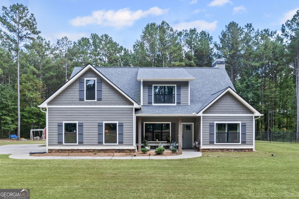 Fabulous Craftsman Home on 5.28 acres!! Open Kitchen with hardwood flooring, Silestone countertops with designer tiled backsplash, stainless appliances, Silestone top island with breakfast bar & pantry. Laundry room and drop zone in common area. Vaulted Family Room with stone surround wood burning fireplace, hardwood flooring! Dining Room with trim on the ceiling, ship lap wall & hardwood flooring! Primary bedroom on main with ceiling fan, tiled primary bathroom with double vanities with Silestone countertop, huge tiled designer shower that was redo in 2025 with dual shower heads & nozzles with a frameless glass front! Guest bedroom on main with tiled guest bathroom on main with Silestone top vanity and shower/tub. 2 Guest bedrooms upstairs, one with a closet and one walk-in closet & tiled guest bathroom in hallway with double vanities with Silestone countertop & shower/tub. Large bonus room upstairs!! Covered rocking chair front porch and covered rocking chair back porch overlooking private fenced backyard. Outbuilding for storage, foam insulation, short drive to Interstate 85!!