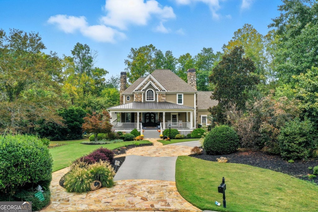 Live where craftsmanship, comfort, and resort-style living come together. This move-in-ready estate sits on 1.49 acres at the end of a private cul-de-sac, backing to the ultimate private oasis surrounded by the Red Course #1 green and Red #2 fairway. Three kitchens, a finished basement, pool and a private carriage house apartment, this home was designed to host, relax, and grow with you. Step into the soaring two-story foyer and follow the curved staircase into an open-concept main level filled with natural light and timeless finishes. The heart of the home is the coffered-ceiling family room with a stacked-stone fireplace, built-in shelving, and full-height windows that bring the outside in. The updated chef's kitchen features quartz countertops, a six-burner gas range with custom vent hood, subway tile backsplash, a large center island, stainless steel appliances, walk-in pantry, and a butler's pantry. A formal dining room and dedicated home office offer flexibility and flow. Off the kitchen, the breakfast nook shines with shiplap walls, wraparound windows, and a double tray ceiling with coffered detailing, a perfect place to start the day. The main-level primary suite is a private retreat. A double tray ceiling crowns the spacious bedroom, which includes a sitting room or office, private access to the back deck, and a spa-inspired en suite bathroom with dual vanities, a jetted soaking tub, a walk-in tiled shower with dual shower heads, and an oversized walk-in closet with direct access to the laundry room. Upstairs offers three large bedrooms and two full baths, with open views to the main living area below. The finished lower level is a full living space of its own, complete with two flex rooms currently used as bedrooms, a full bath, a second kitchen, a game room, a theater room, and a cozy third fireplace. This level opens out to the backyard and covered patio. Step outside and you'll find a backyard built for every season, fully fenced and professionally landscaped. Centered around a heated pool and spa, the space includes a full outdoor kitchen, firepit, and gazebo with a centerpiece fireplace, creating the ultimate space to gather or unwind. The detached carriage house offers even more: a full kitchen, living area/bedroom, laundry and bathroom, ideal for guests, extended stays, or extra income potential. Located in sought-after Bradshaw Farm, you'll also enjoy access to golf, multiple pools, tennis courts, pickleball, volleyball, basketball, a clubhouse, and playgrounds, all in one of Woodstock's most desirable neighborhoods.