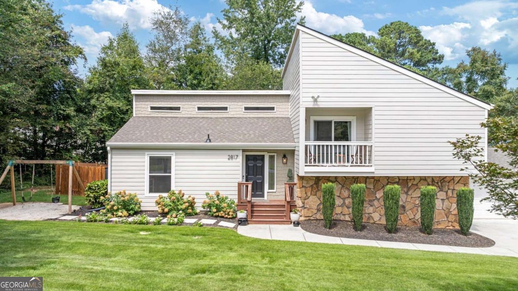 Modern design, unbeatable schools, and a backyard built for entertaining-this East Cobb contemporary truly has it all. Located in the sought-after Mountain View and Pope High School district, this beautifully updated 3-bedroom, 2-bath home with a finished basement offers style and functionality in equal measure. A fresh exterior with a new roof, new siding, a charming front balcony, and manicured landscaping creates instant curb appeal, while the long, level driveway adds convenience. The usable front yard, complete with a swing set, offers additional outdoor space perfect for play or relaxing under the trees. Inside, a welcoming foyer leads to a show-stopping great room featuring cathedral ceilings, exposed beams, a painted brick fireplace, and hardwood floors throughout the main level. The dining area is perfectly placed with views of the private backyard, while the spacious eat-in kitchen boasts granite countertops, stainless steel appliances, a pantry, and ample storage. The primary suite is a true retreat with its own front-facing balcony and a recently renovated bath featuring dual vanities and a frameless glass shower. Two generously sized secondary bedrooms offer flexibility for guests or a home office. Downstairs, the finished basement has been transformed into a media haven with space for a potential 4th bedroom. Major updates include a tankless water heater, new electrical panel, and an EV charging station in the garage, making this home as functional as it is stylish. Step outside to your fenced-in level backyard oasis, featuring lush Zoysia grass, a large deck for summer BBQs, patio seating area, and a storage shed-perfect for kids, pets, and entertaining alike. With no HOA, top-ranked schools, and just minutes from shopping and dining, this is the one you've been waiting for.